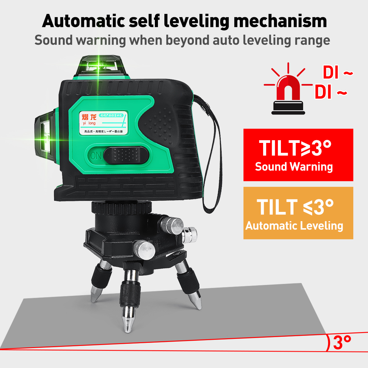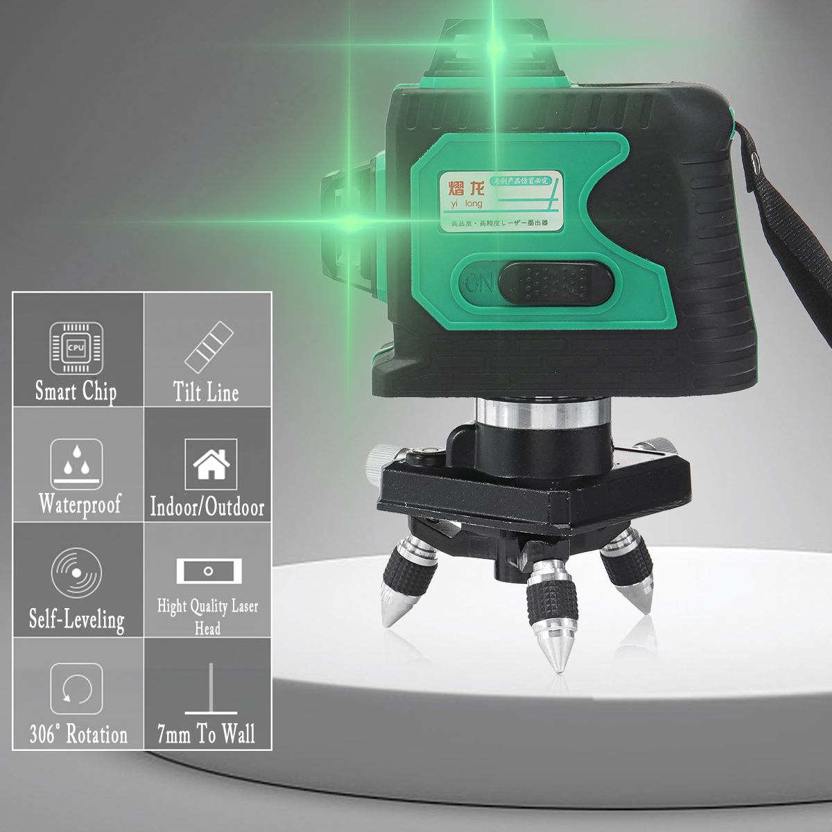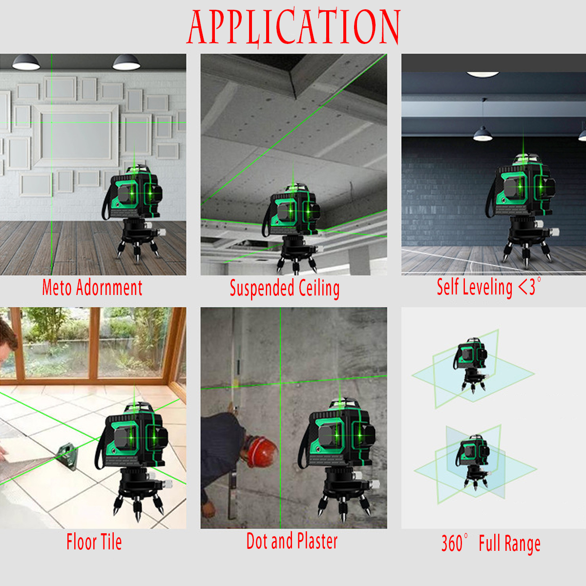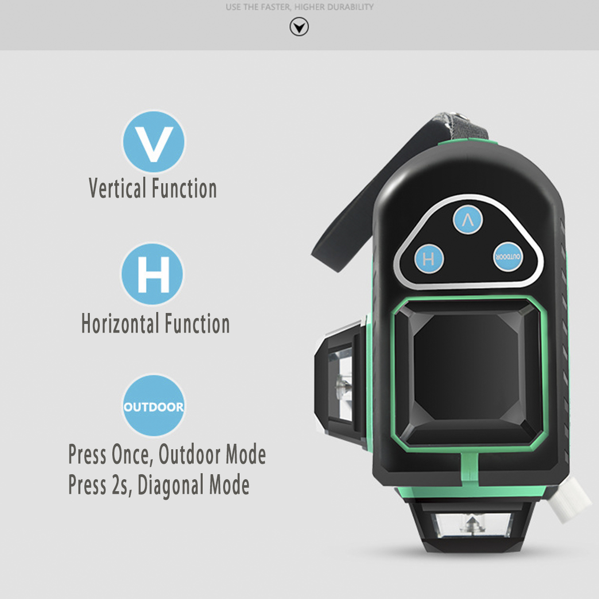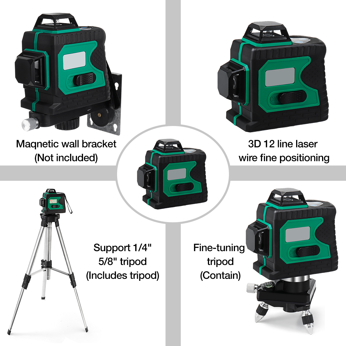 Ammattilaistason itsetasaava 12-viivainen vihreälinjainen laser, joka tarjoaa nopean ja tarkan kohdistuksen sisä- ja ulkokäyttöön. Vankka metallipohja, roiskevesitiivis painikepaneeli ja helppo kuljetus suojalaukun avulla.