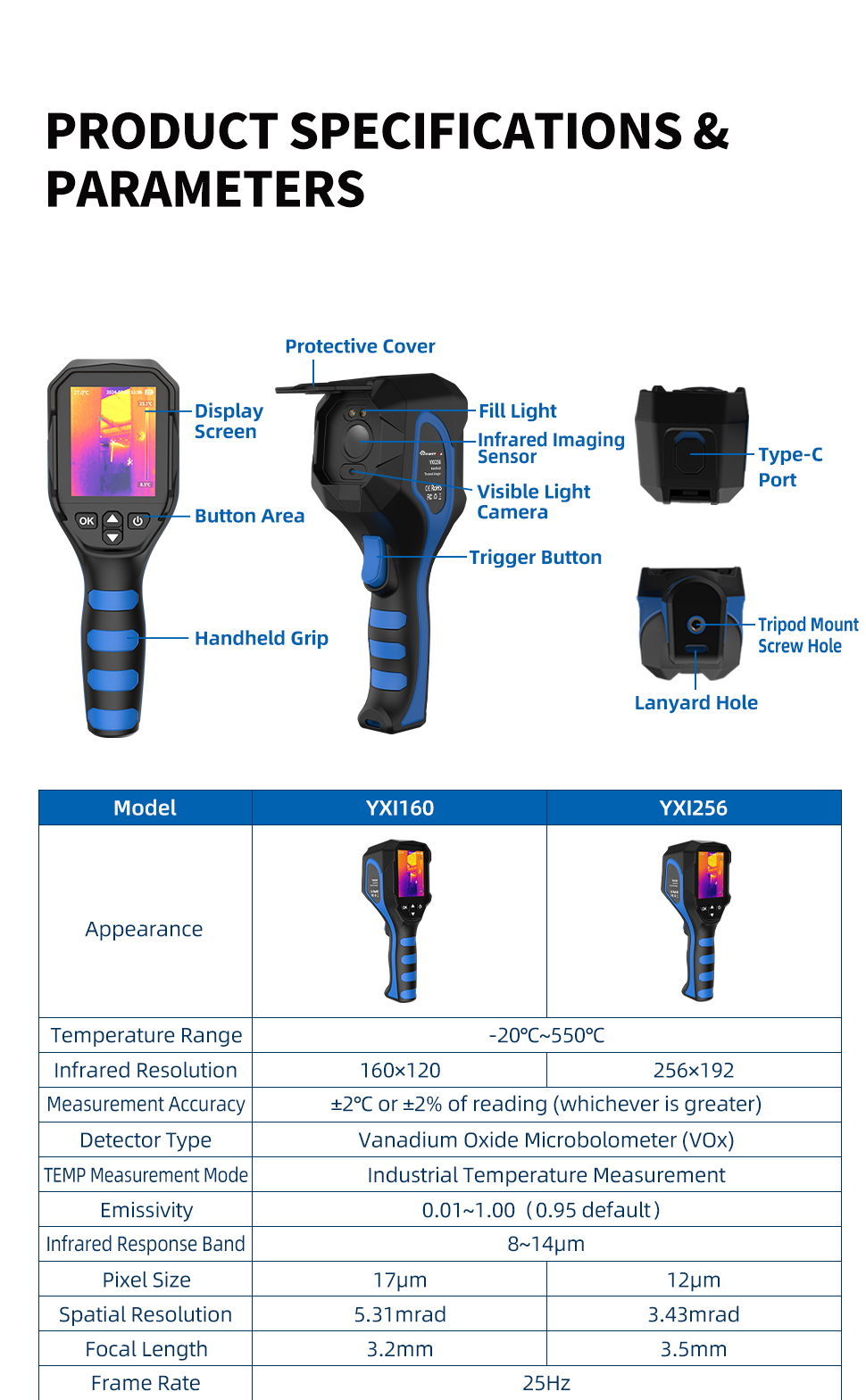 YXI256 tarjoaa laajan lämpötila-alueen -20℃ – 550℃ ja hyvän mittaustarkkuuden (±2℃ tai ±2 %), minkä ansiosta se soveltuu luotettavasti teollisiin, sähköteknisiin ja mekaanisiin tarkastuksiin.