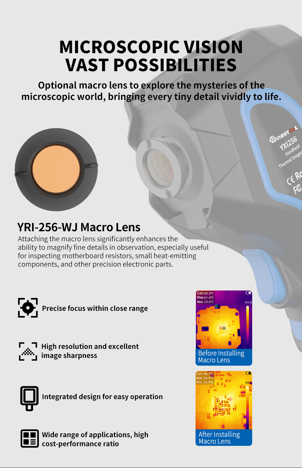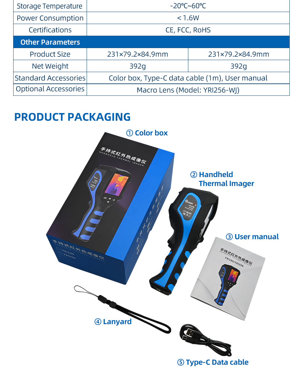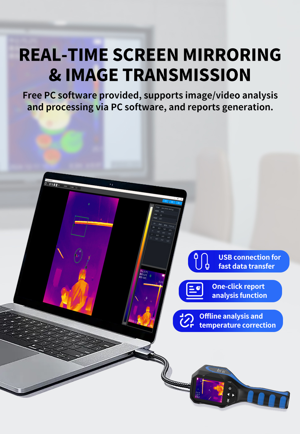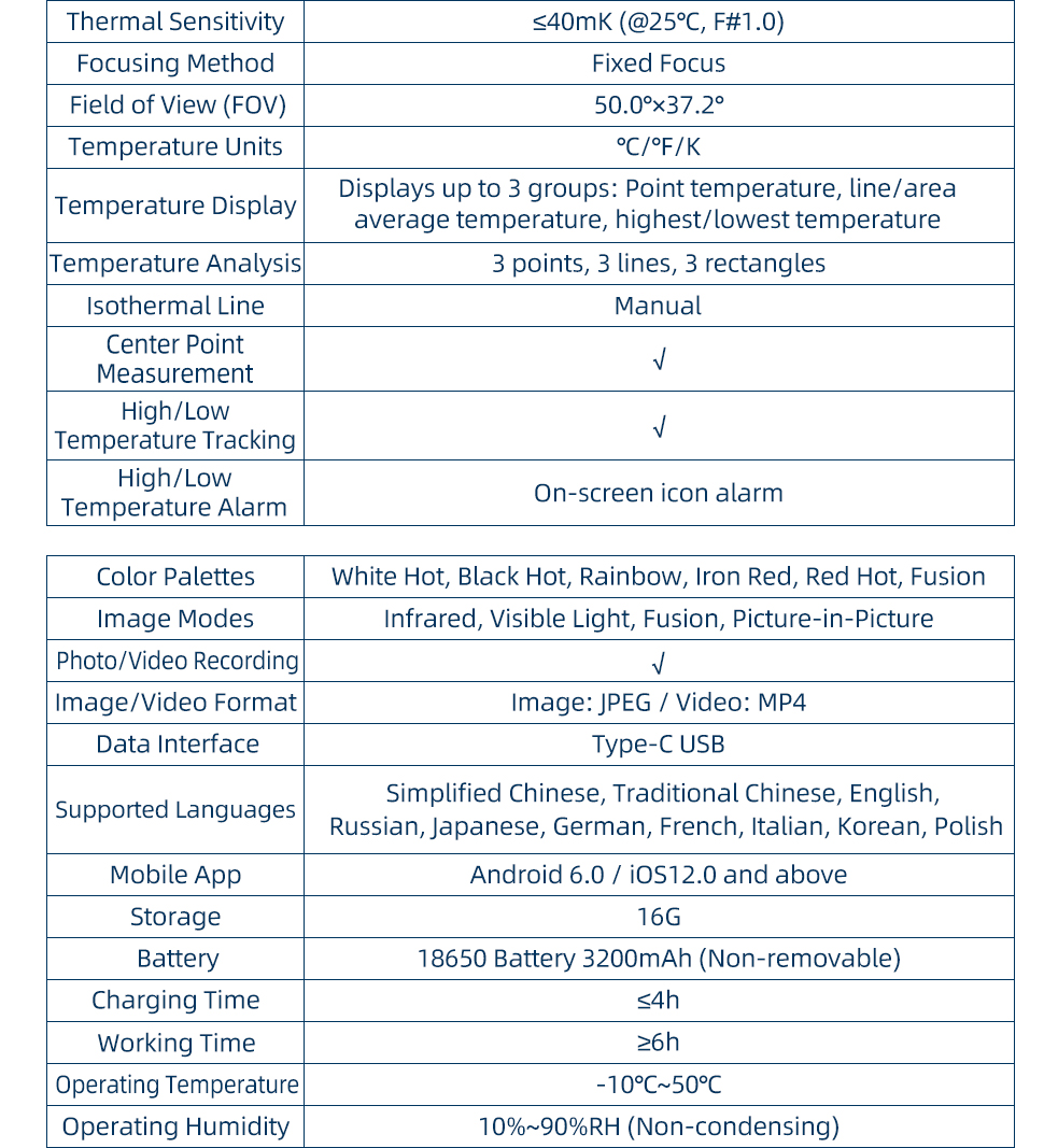 Kiinteä tarkennus ja 50.0° × 37.2° kuvakulma tekevät käytöstä vaivatonta. Type-C USB -liitäntä sekä Android- ja iOS-yhteensopiva mobiilisovellus tukevat tietojen tarkastelua ja analysointia reaaliajassa.