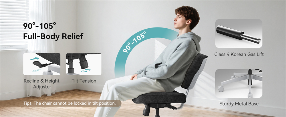 Selkänojan kallistus 90°–105° mahdollistaa sekä mukavan pystyasennon että rennon takakenon. Vedä säätövipua vapauttaaksesi kallistuksen ja vaihtaaksesi helposti työ- ja lepoasennon välillä.