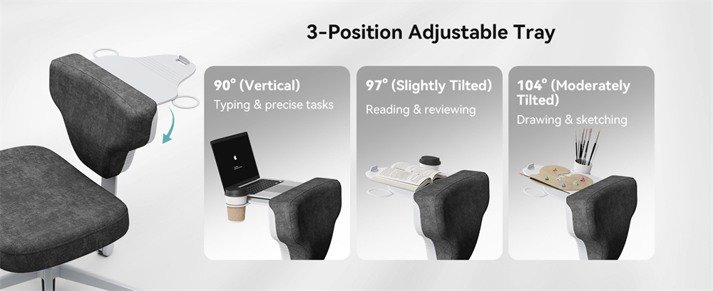 Selkänojassa on kannatinlevy, jossa on 3 säätöasentoa lukemiseen, työskentelyyn ja muihin tehtäviin. Levyn korttipaikka estää esineiden putoamisen, ja molemmilla sivuilla olevat piilotetut mukipidikkeet helpottavat juoman tai pienten välipalojen sijoittamista.