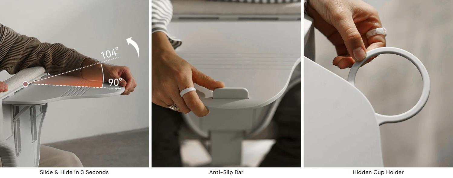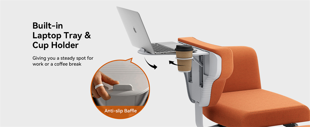 Selkänojassa on laajennettava kannettavan taso ja piilotettu mukiteline. Voit asettaa tasolle kannettavan, tabletin tai välipalat. Sopii kotitoimistoon ja vapaa-ajan viihteeseen, erityisesti pieniin tiloihin. Avaa Freedom-X -tuolin monipuoliset mahdollisuudet!
