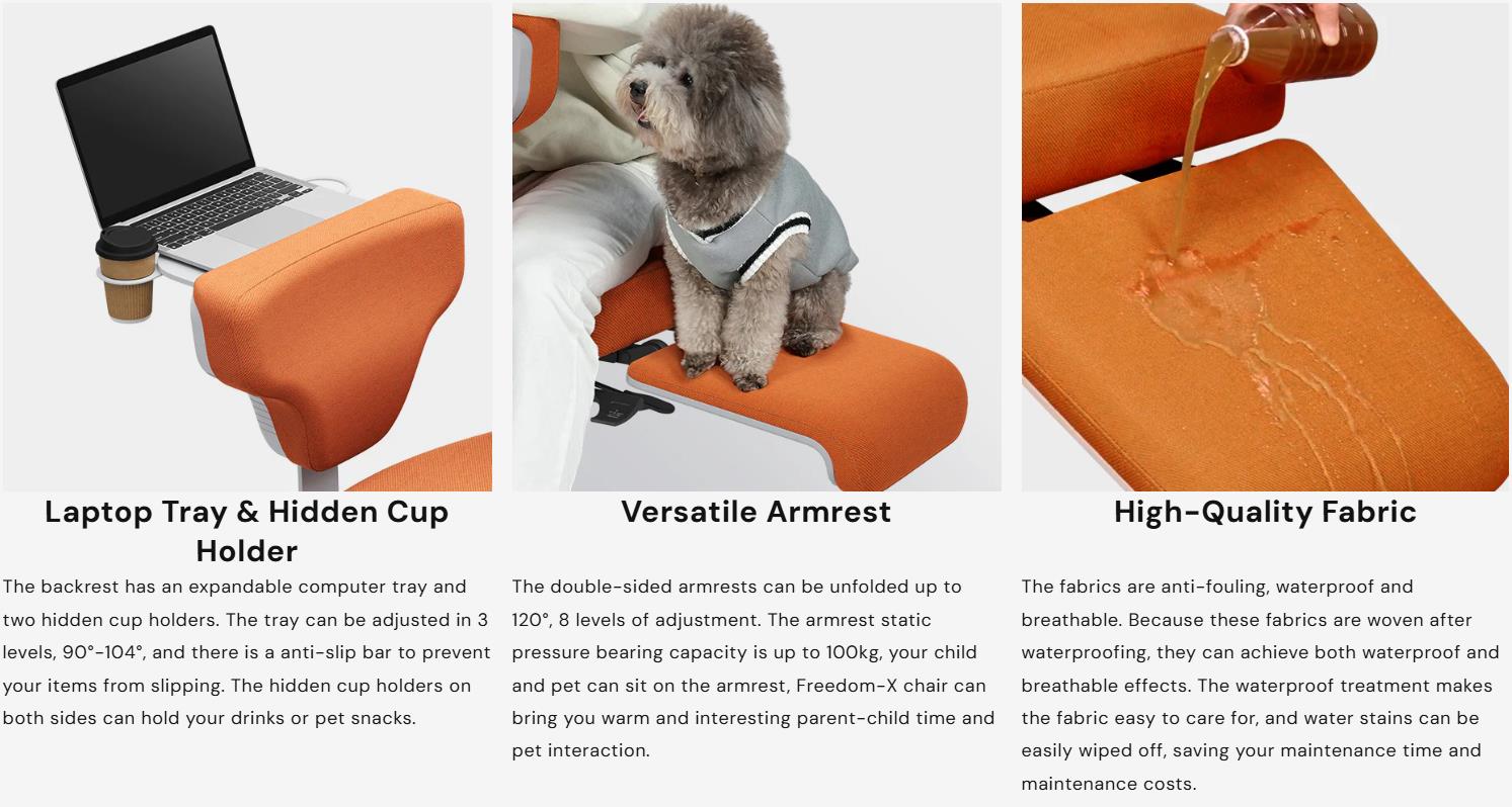 Jos lemmikki tulee syliin tai keskeyttää työn, Freedom-X auttaa. Aseta lemmikki käsinojalle – voitte olla vierekkäin, ja voit silittää sitä milloin tahansa työn lomassa.