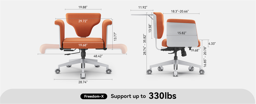 Säädettävä käsinoja kääntyy jopa 120° ja tarjoaa 8 säätötasoa. Käsinojan staattinen kantavuus on jopa 100kg. Voit istua tuolissa yhdessä lemmikin tai lapsen kanssa – Freedom-X luo lämpimiä perhehetkiä ja hauskaa yhteistä tekemistä lemmikin kanssa.