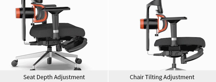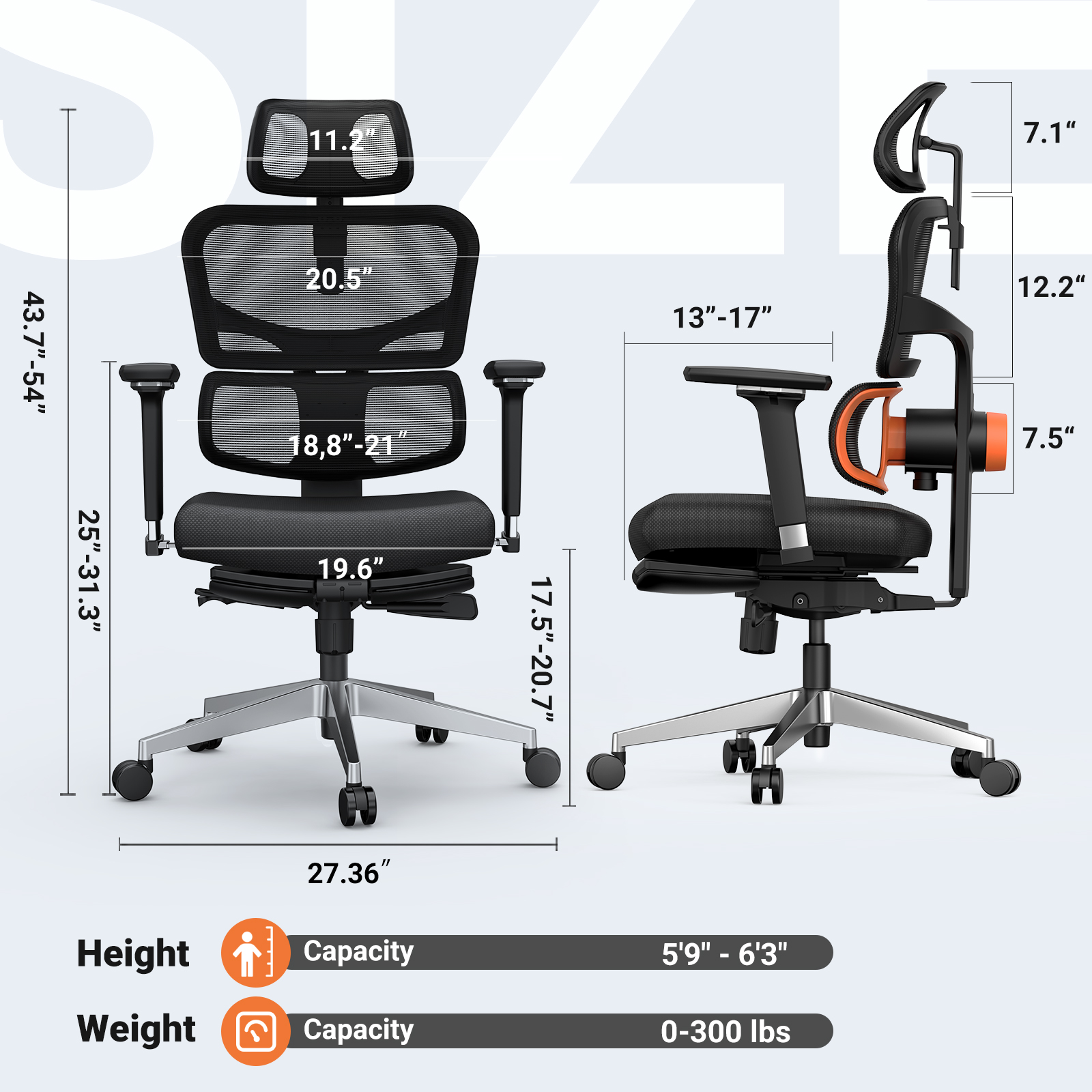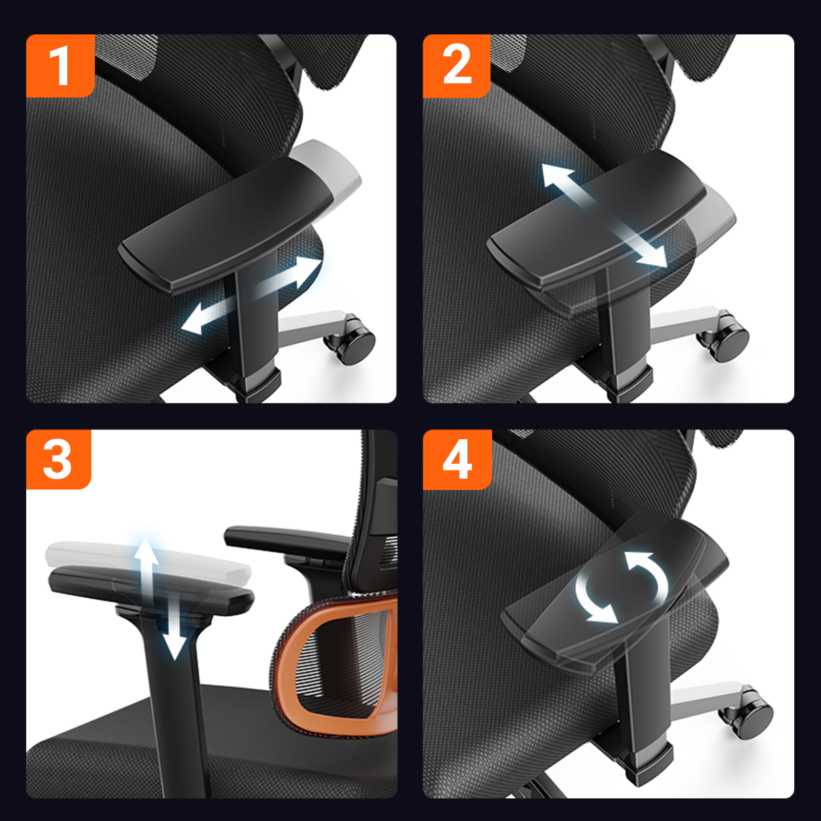 Selkänoja kallistuu ja lukittuu välillä 96°–136°. Säädettävä niskatuki (kulma ja korkeus) auttaa löytämään mukavan asennon niskalle. Istuimen korkeutta ja syvyyttä voi säätää, ja 4D-käsinojat viimeistelevät ergonomisen istuma-asennon töissä tai pelatessa. Säädettävä ergonominen tuoli sopii henkilöille noin 5'3'–6'3'. Kantavuus jopa 300 paunaa.