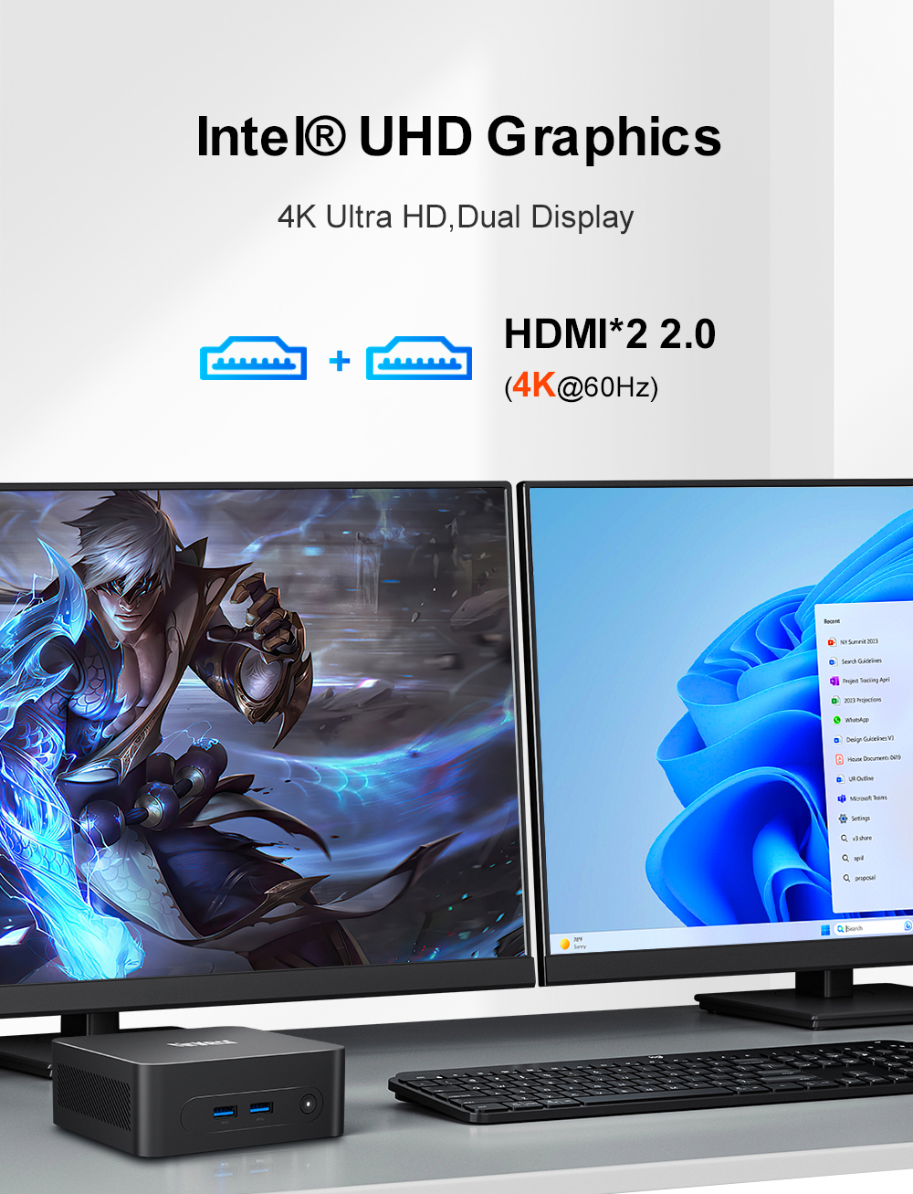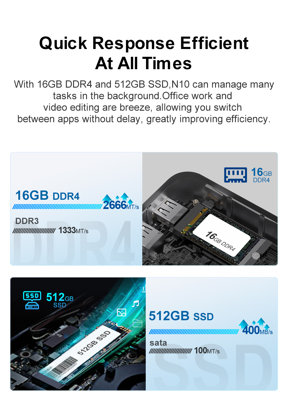 Kompakti Ninkear N10 -minitietokone tarjoaa sujuvan Windows 11 -käyttökokemuksen, tehokkaan Intel Alder Lake N100 -suorittimen, 16GB muistin ja 512GB SSD-tallennustilan. Kaksois-HD-näyttölähtöjen ansiosta työskentelet mukavasti usealla näytöllä, ja kattavat liitännät helpottavat oheislaitteiden käyttöä.