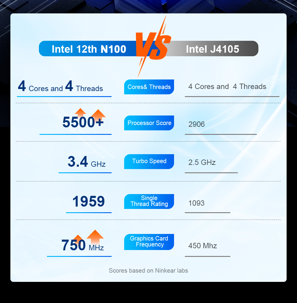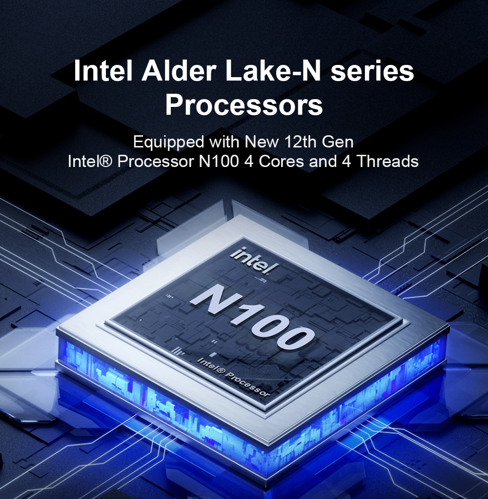 • Intel Alder Lake N100, neliydin jopa 3.4GHz – energiatehokas suoritus arjen tehtäviin