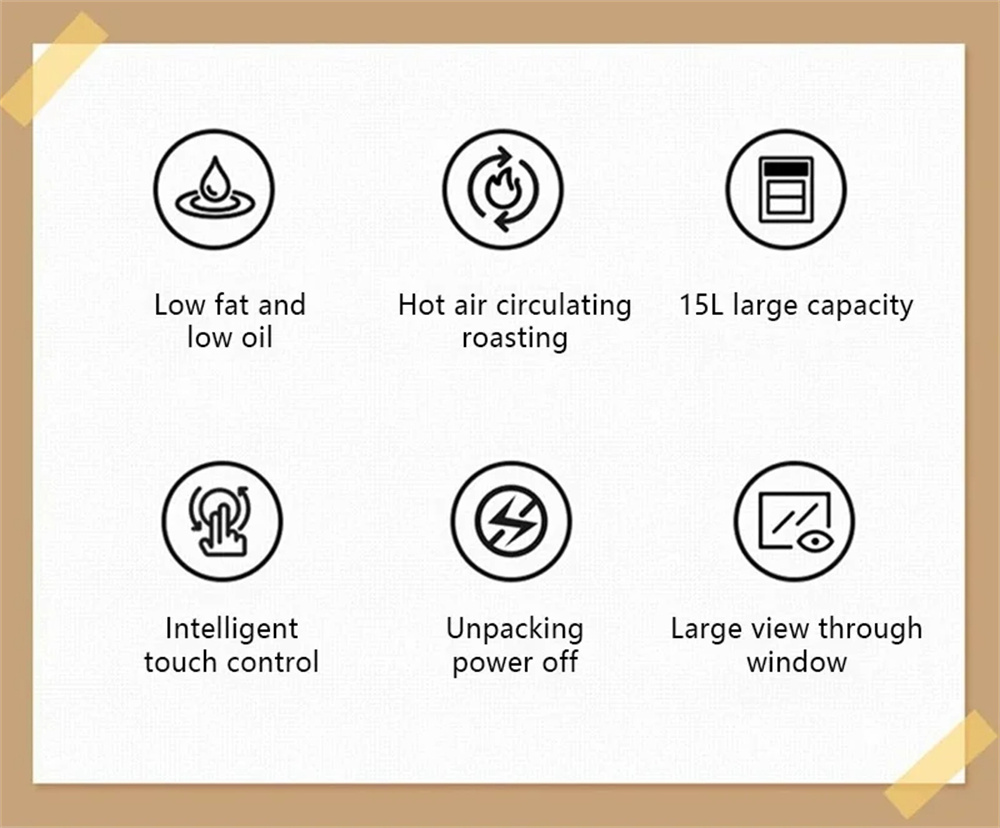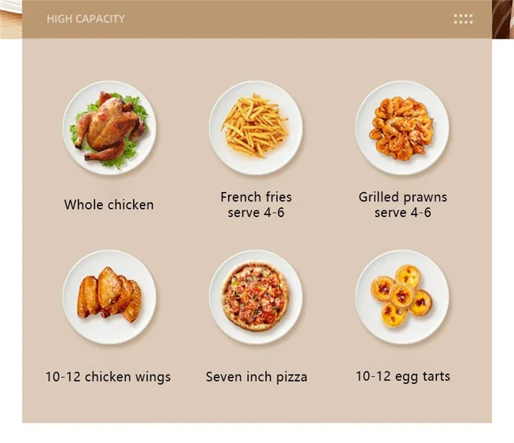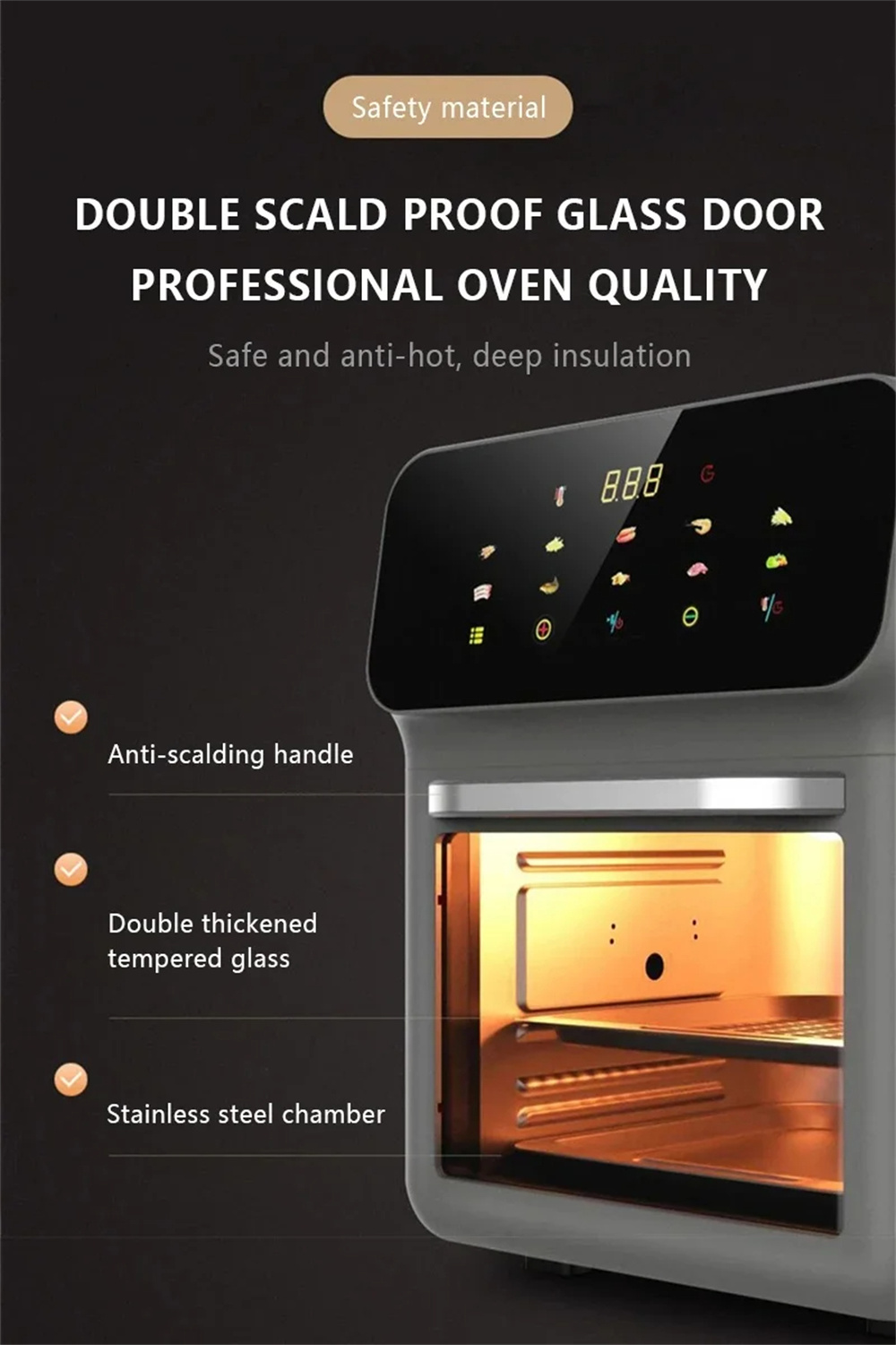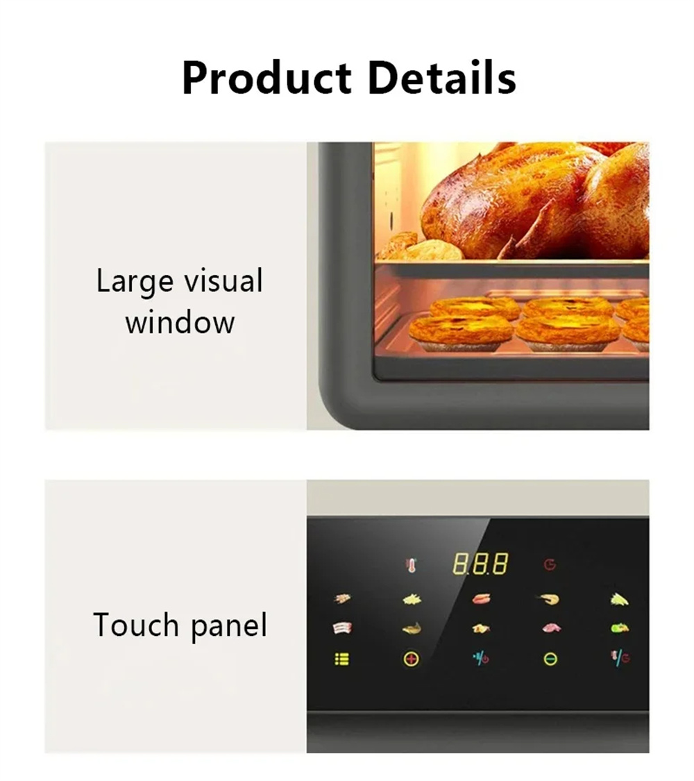 - Suuri näkyvä ikkuna: Näe kypsyminen selkeästi suuren ikkunan läpi ja hallitse paistoa helposti kosketusnäytöllä varustetussa ilmafriteerauskeittimessä.