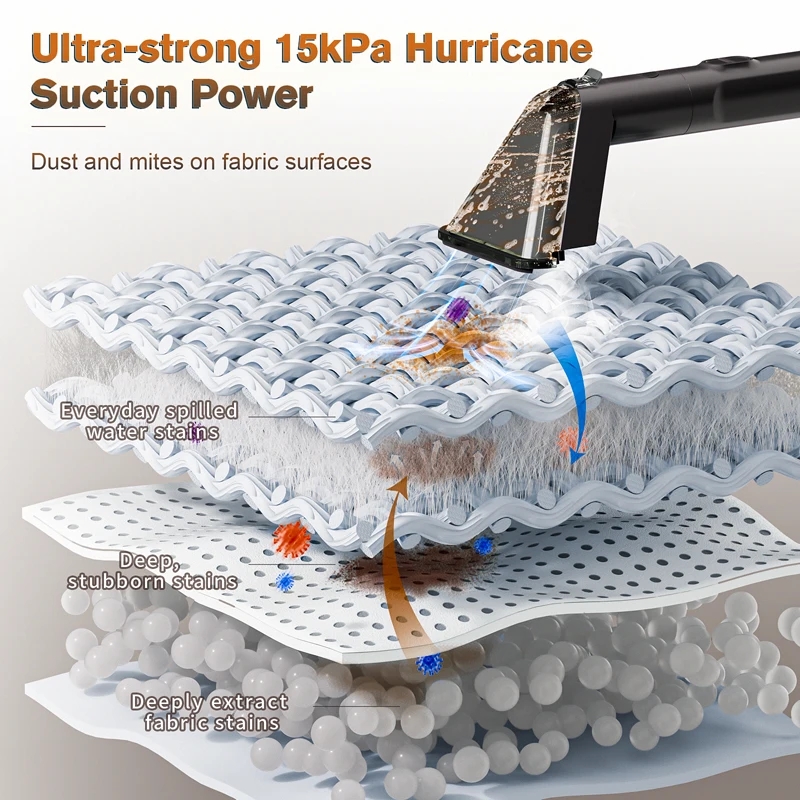 3. Nopea kuivuminen ja monikäyttöisyys: sopii matoille, sohville, auton sisätiloille, verhoille, laatoille ja ikkunoille. Kompakti ja kevyt rakenne helpottaa käsittelyä.