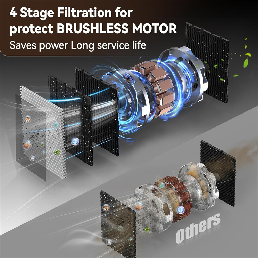 - Edistynyt 5-kerroksinen suodatus: sieni-esisuodatin + HEPA-poistosuodatin
