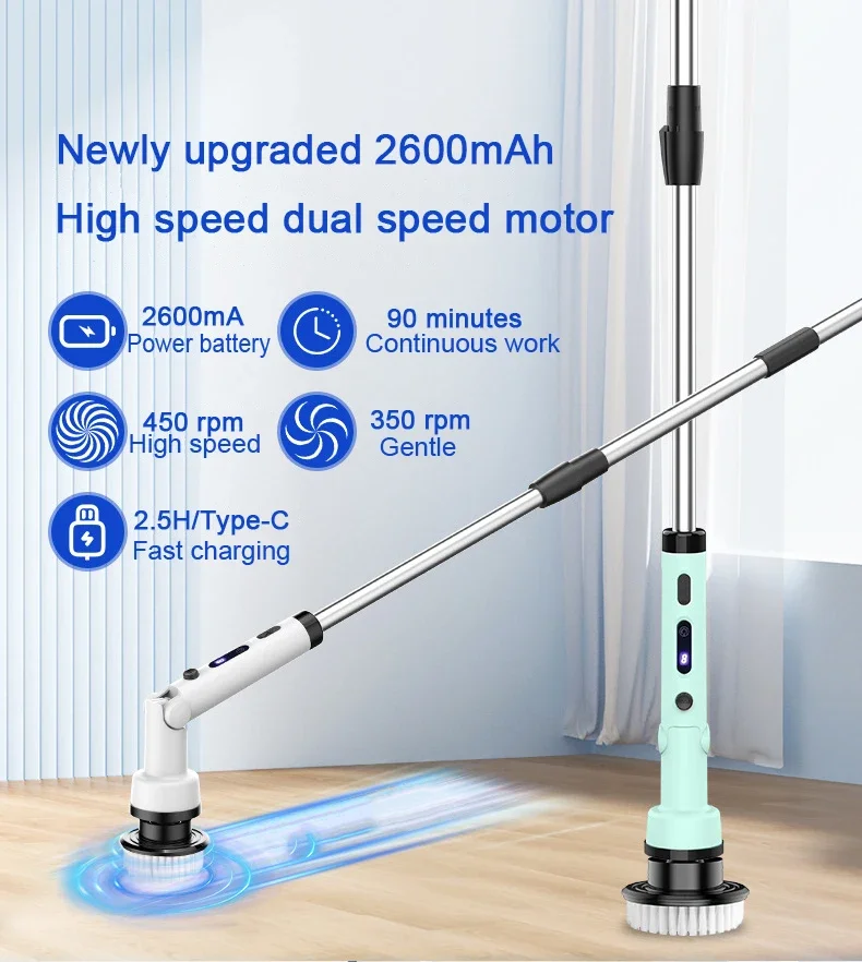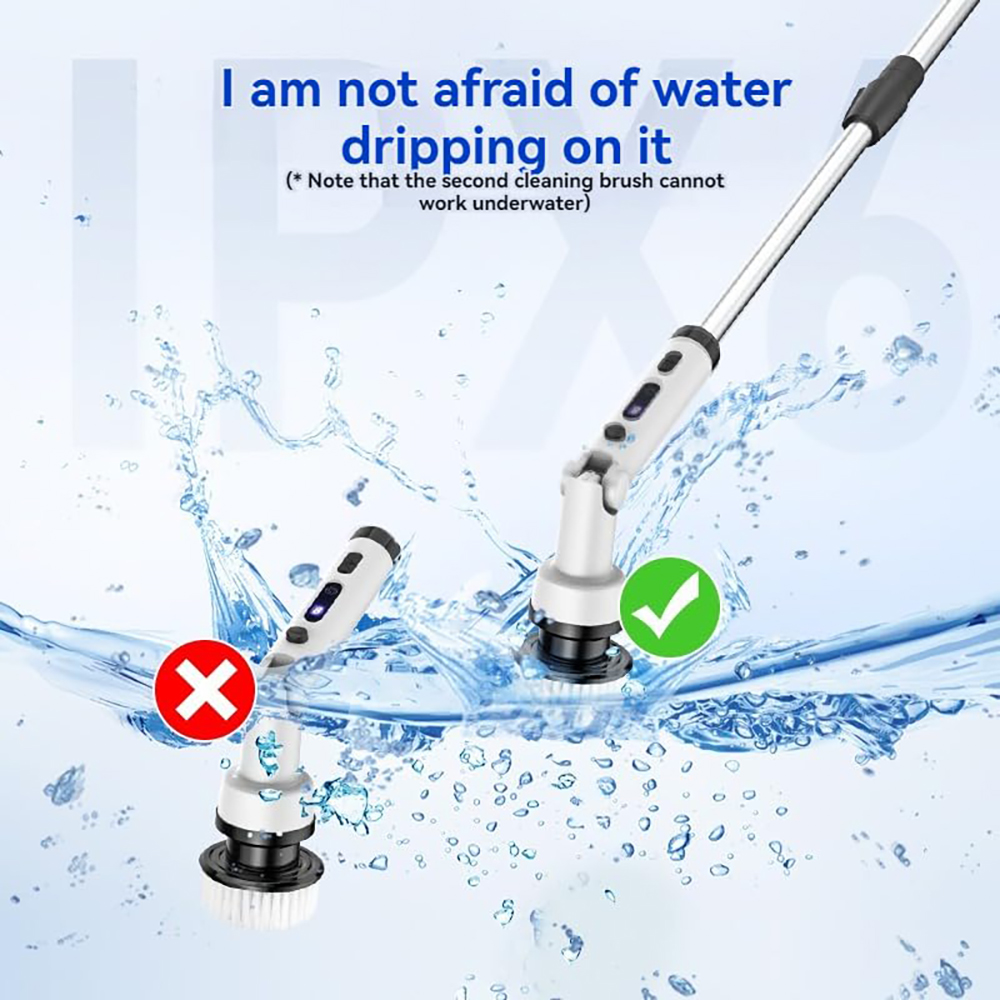 Sähkökäyttöinen harja monipuoliseen kodin puhdistukseen. Kaksi pyörimisnopeutta, säädettävä harjapään kulma ja teleskooppivarsi helpottavat pinttyneen lian, saippuajäämien ja saumojen puhdistusta ilman kumartelua.