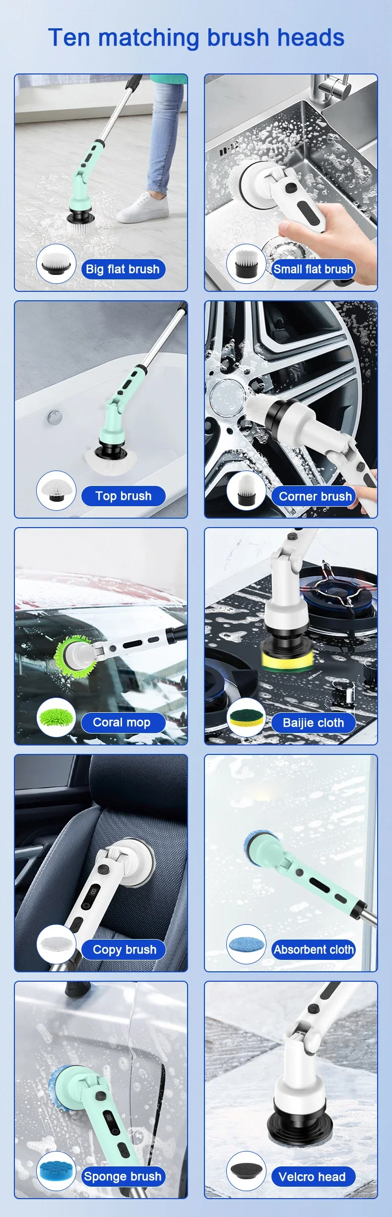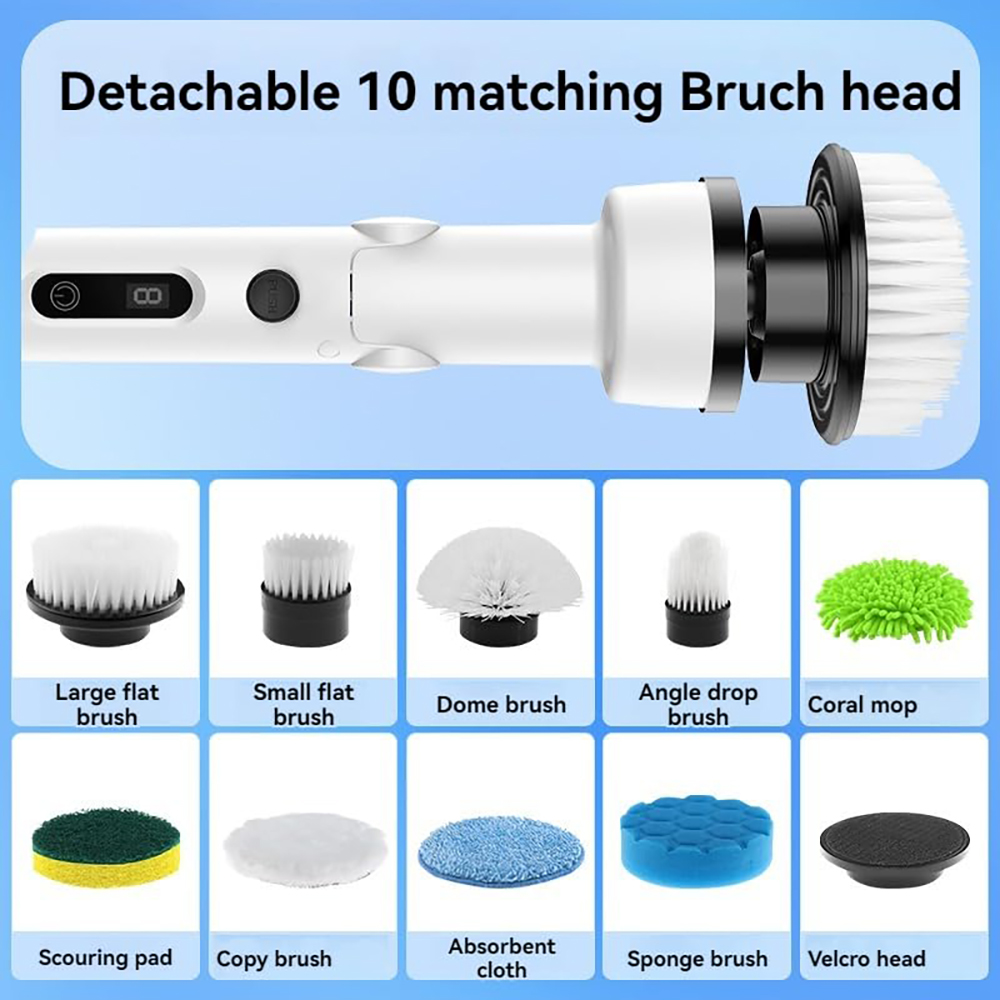 - Monipuoliset harjat kaikkiin tarpeisiin: 9 erilaista harjaa, mm. kupolimallinen, suuri taso-, pieni taso-, kulma-, sieni- ja hankaustyynyharja. Sopii kylpyhuoneeseen, keittiöön, auton ikkunoihin ja vaikeapääsyisiin kulmiin.