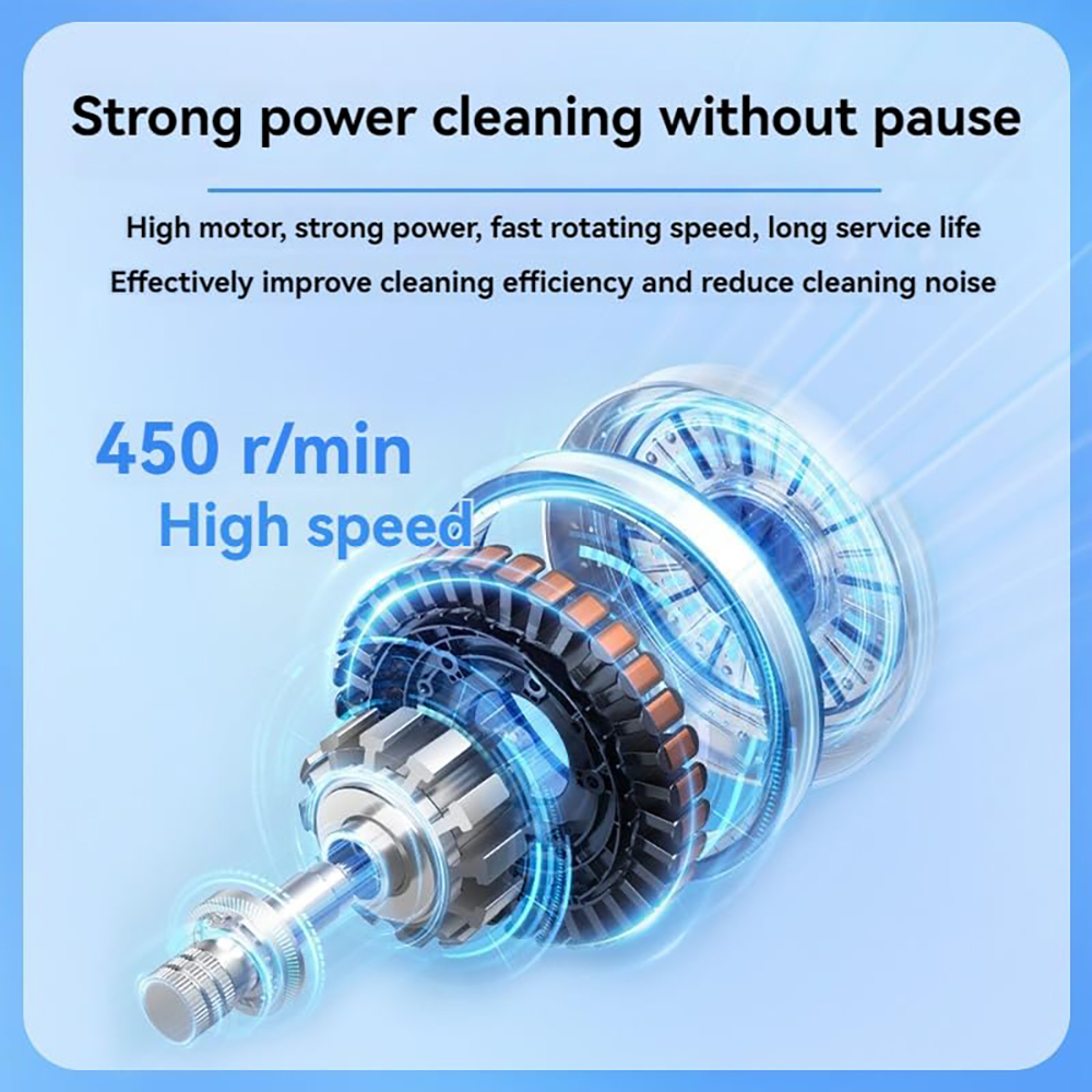 - Kaksi pyörimisnopeutta tehokkaaseen puhdistukseen: 350 rpm arjen siivoukseen ja 400 rpm sinnikkäämmälle lialle. Poistaa nopeasti saippuajäämät, saumat ja pinttyneen lian.