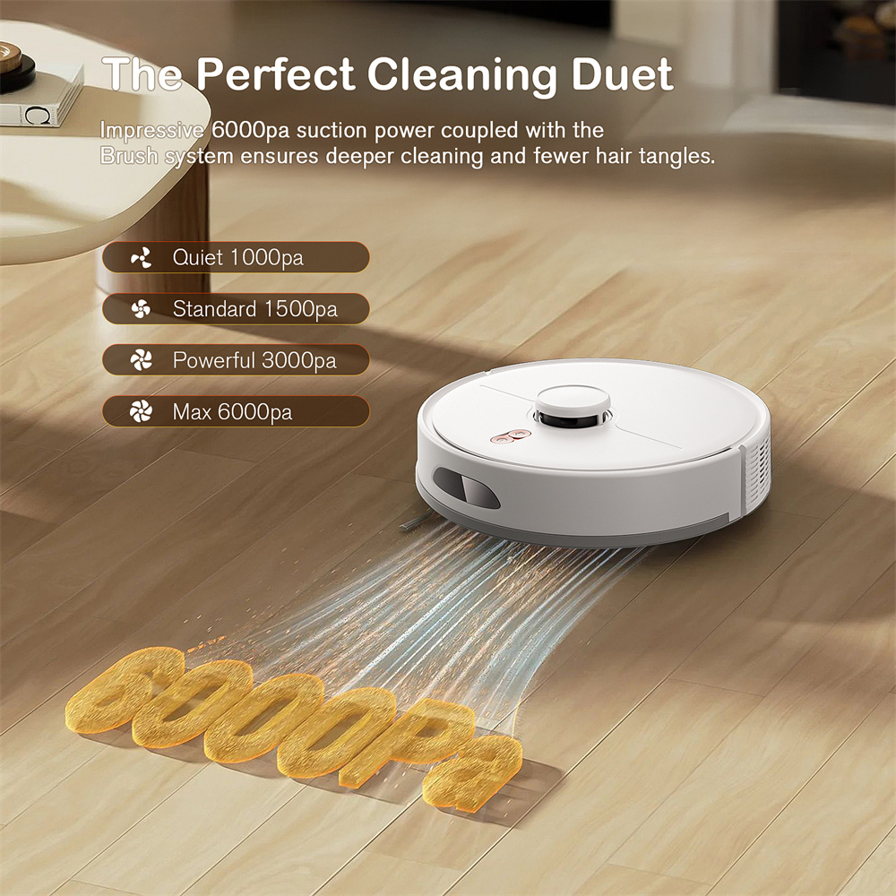 3. 6000Pa voimakas imu: Poistaa tehokkaasti roskat kovilta lattioilta ja matalilta matoilta, sopii laatoille, puulattioille ja matalille nukille.