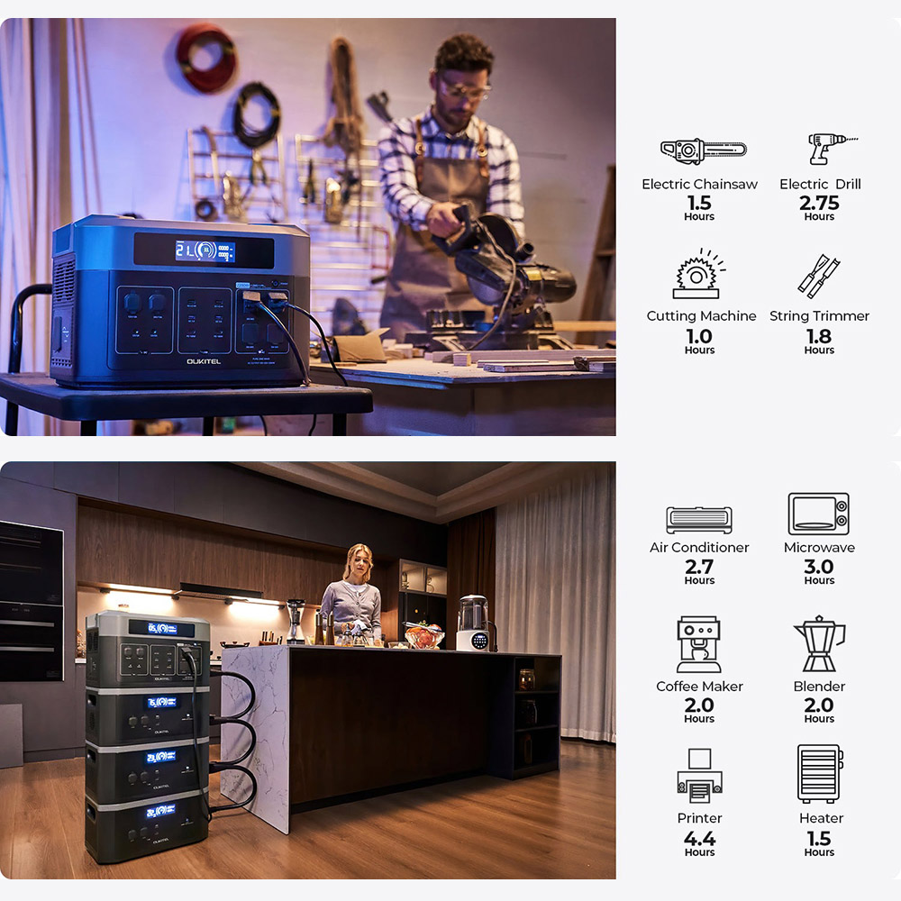 Kapasiteetin laajennus: OUKITEL B2000 -lisäakussa on suuri 2048Wh:n kapasiteetti. Sitä voidaan käyttää yhdessä OUKITEL BP2000 Pro -kannettavan virtalähteen kanssa ja laajentaa sen kapasiteettia jopa 16384Wh asti (enintään 7 kpl B2000-lisäakkuja).