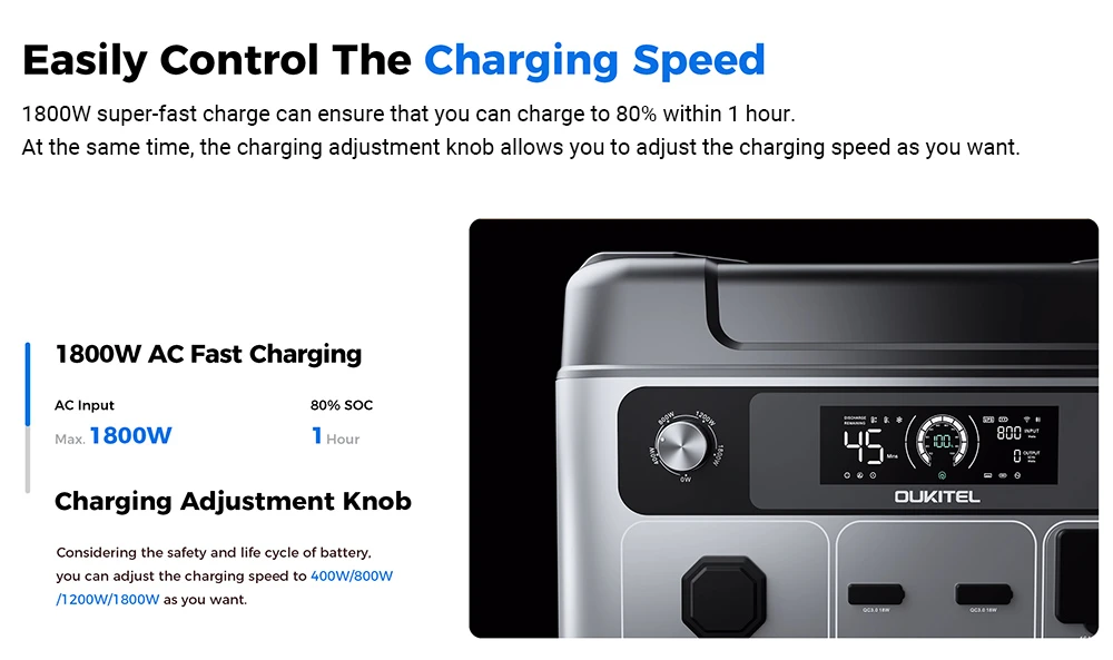 OUKITEL P2001 Plus on tehokas siirrettävä varavirtalähde kotiin, mökille ja retkikäyttöön. Suuri 2048Wh kapasiteetti ja 2400W nimellisteho riittävät useimpien kodinkoneiden, työkalujen ja elektroniikan käyttöön sekä varavirtana sähkökatkojen aikana.