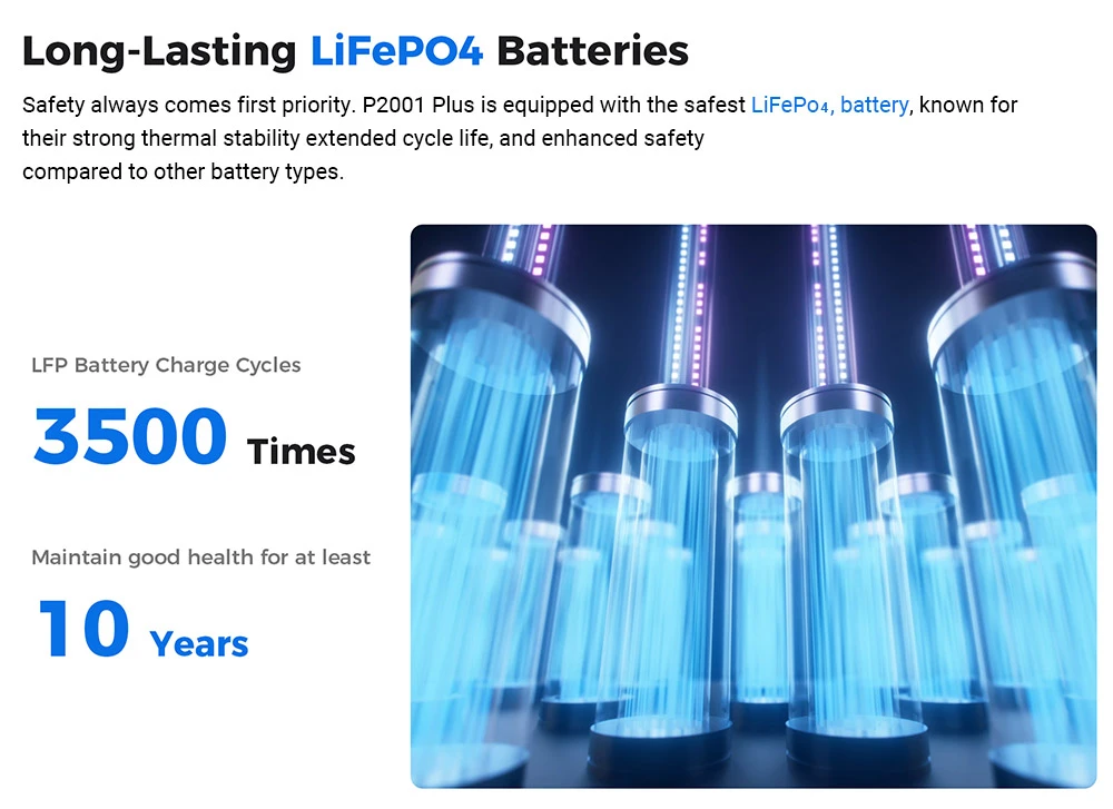 Turvallinen ja ympäristöystävällinen LiFePO4-akku yhdessä BMS-akkusuojauksen kanssa tarjoaa useita suojaustoimintoja ja yli 3500 lataussykliä, kun kapasiteetista on vielä 80 % jäljellä. UPS-toiminto käynnistyy automaattisesti noin 0,1 sekunnissa, ja ulostuloteho on kasvanut aiemmasta 1100W tasosta 2000W tasolle.