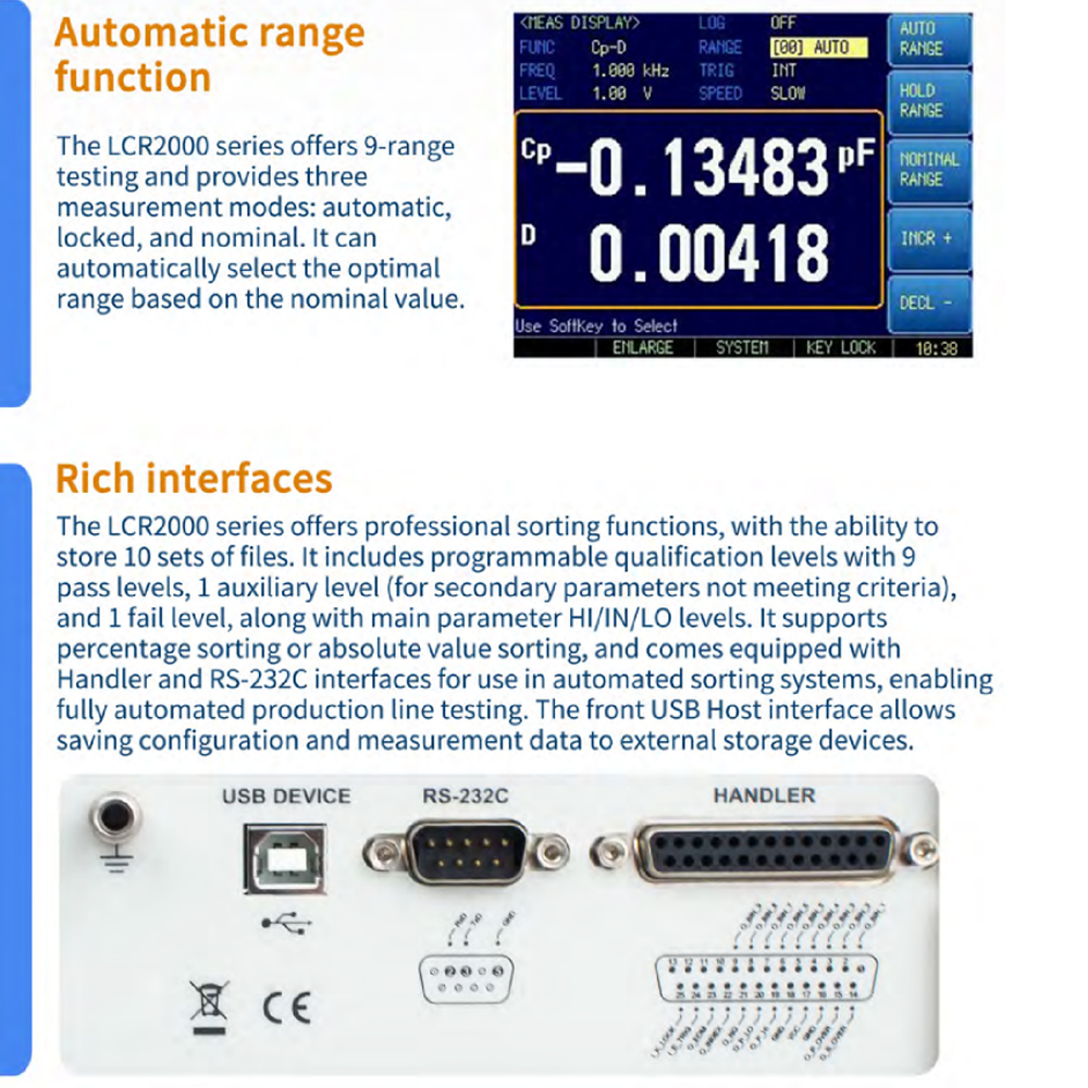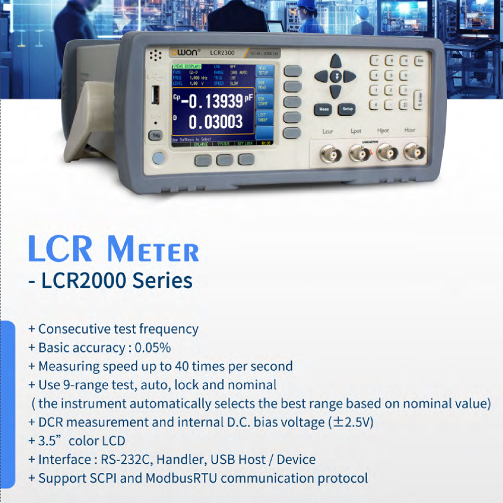 Tarkkuus-LCR-mittari LCR2000 Series soveltuu laboratoriokäyttöön, tuotantotestaukseen ja tuotekehitykseen, kun tarvitaan nopeaa ja tarkkaa induktanssin, kapasitanssin ja resistanssin mittausta. Jatkuva taajuusalue, korkea tarkkuus ja joustavat liitännät helpottavat integrointia erilaisiin testausympäristöihin.