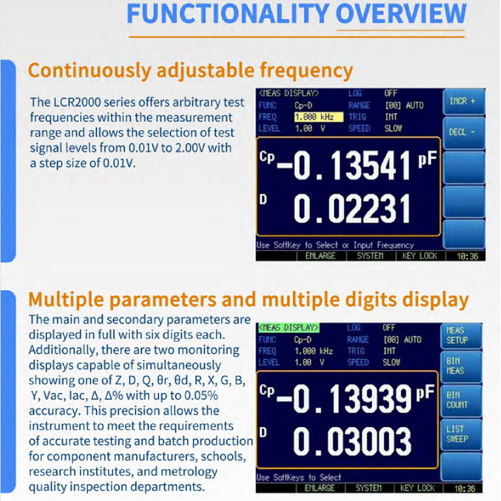 1. Jatkuva testitaajuus: LCR2000 Series -sarja tarjoaa jatkuvan testitaajuusalueen, mikä mahdollistaa laajan valikoiman mittaus- ja testisovelluksia.