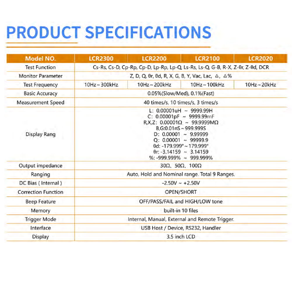 - Testitaajuus: 10Hz~100kHz (LCR2100), 10Hz~20kHz (LCR2020)