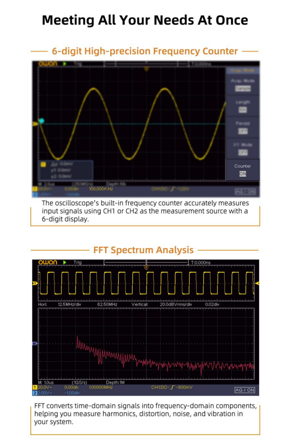 Nopea näytteenotto: 1 GS/s reaaliaikainen näytteenottotaajuus tarjoaa tarkan signaalin tallennuksen ja analyysin.
