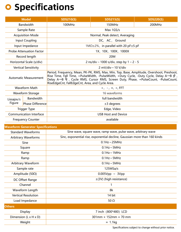 1 x SDS210S / SDS215S / SDS220S oskilloskooppi (valinnainen malli)