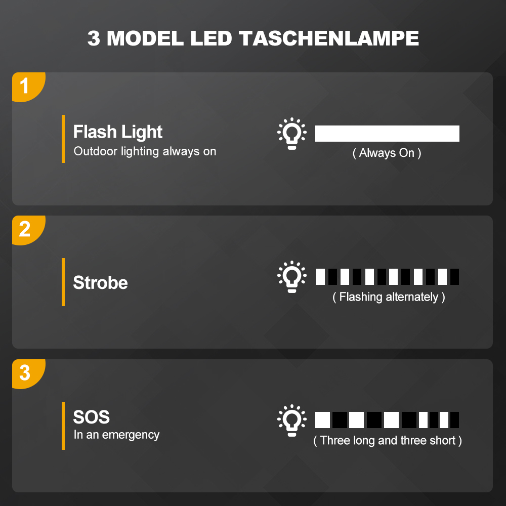 - Edistynyt design: kirkas, suuri LED-valo, 3 tilaa (taskulamppu/SOS/strobo), valaisee yhtäjaksoisesti 4 päivää. Kestävä kuori suojaa vedeltä, pölyltä ja pudotuksilta.