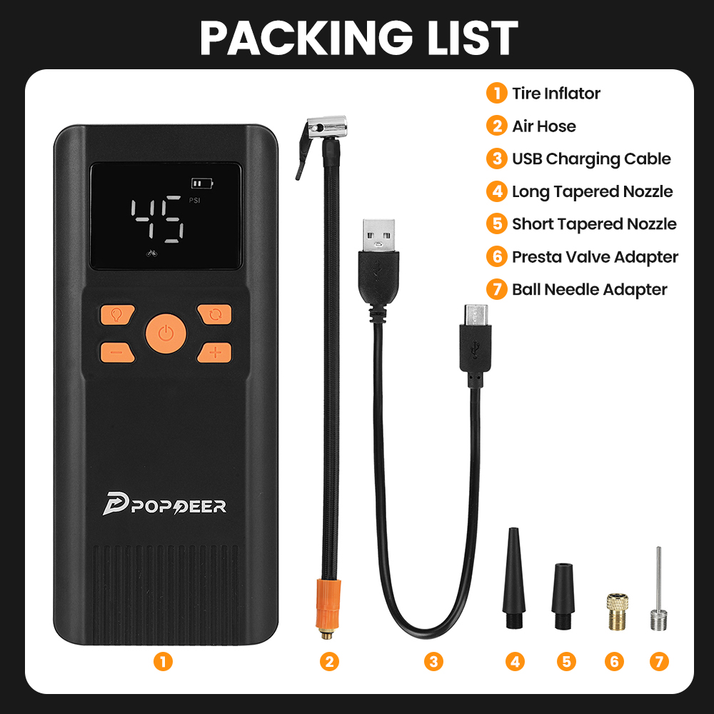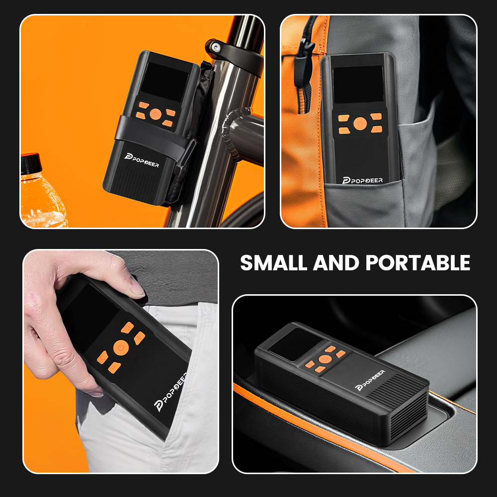 POPDEER PD-AP1 on kompakti, langaton ilmapumppu autonrenkaille, urheiluvälineille ja pienille ilmatäytteisille tuotteille. Selkeä LCD-näyttö helpottaa painearvojen seurantaa, ja tehokas rakenne tekee käytöstä nopeaa arjessa ja matkalla.