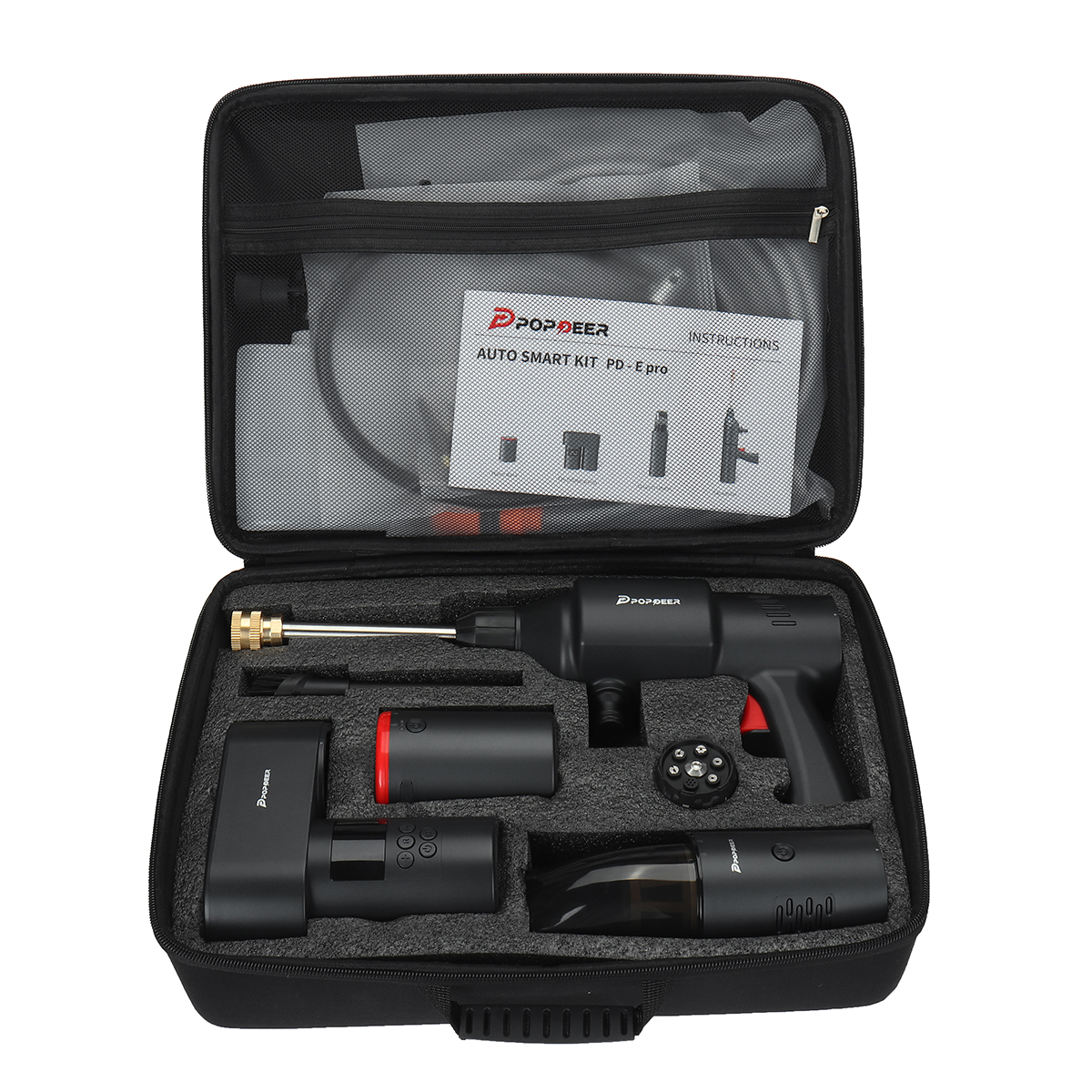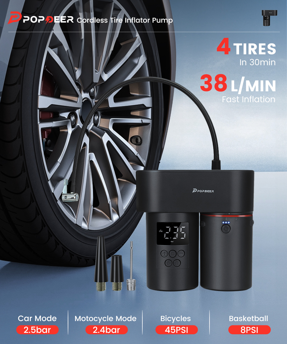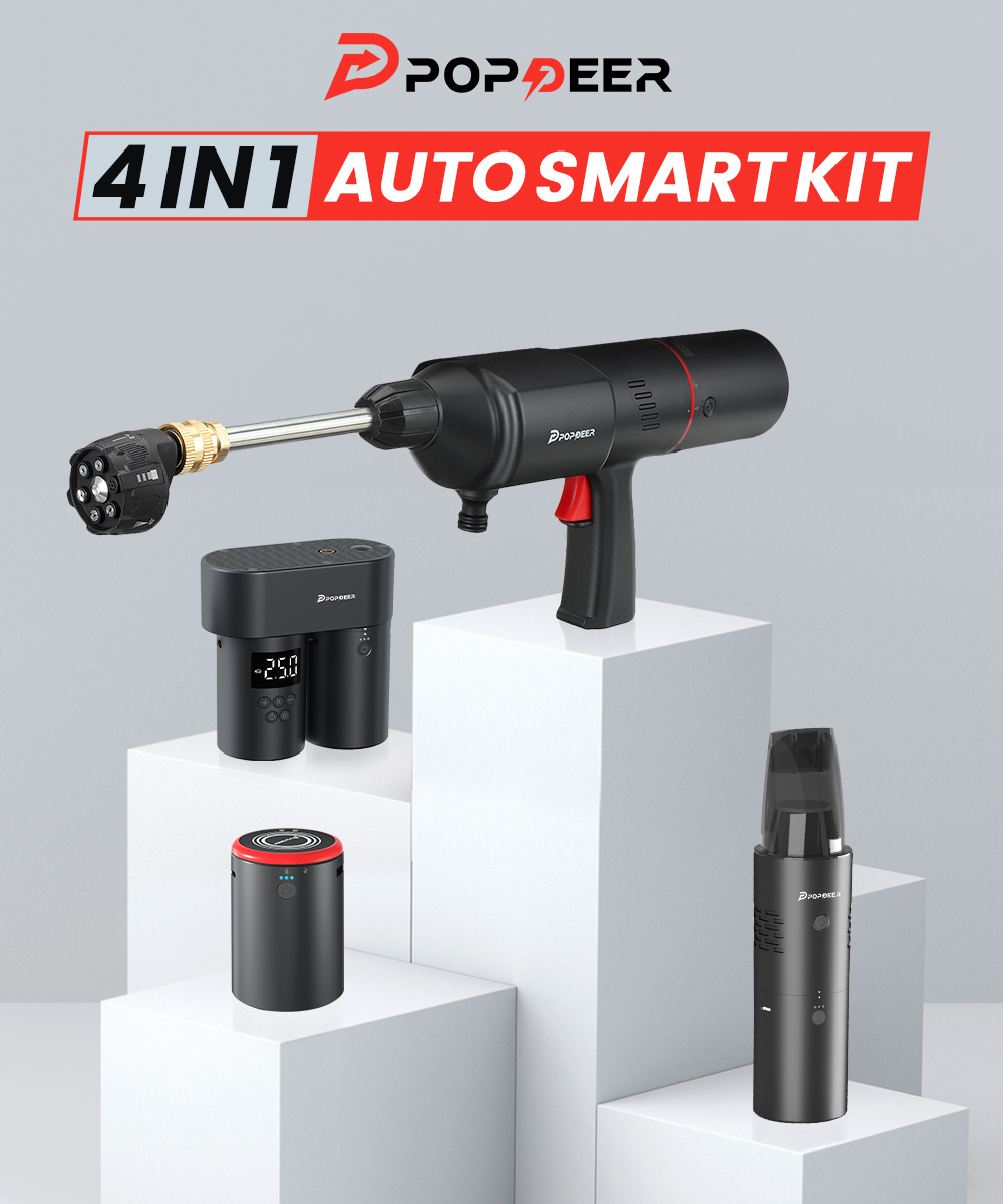 POPDEER 4-in-1 -monitoimilaite yhdistää kompaktissa paketissa renkaan täyttöpumpun, painepesurin, käsikäyttöisen pölynimurin ja varavirtalähteen. Digitaalinen näyttö, esiasetettavat tilat ja automaattinen pysäytys tekevät renkaiden täytöstä helppoa. Painepesuri tarjoaa korkean vedenpaineen ja useita suutinvaihtoehtoja, imuri on pieni mutta tehokas kaksoissuodatuksella, ja varavirtalähde lataa laitteesi USB-, DC- ja langattoman latauksen kautta.