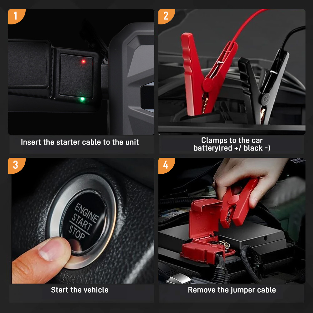 - Tehokas käynnistyskyky: sopii 12V ajoneuvoihin, jopa 10L bensiinimoottoriin tai 8L dieselmoottoriin. Matalajännitepalautus (’RST’-painike) herättää jopa 9V akkuja. Noin 60+ käynnistystä latauksella ja 1,500+ syklin käyttöikä.