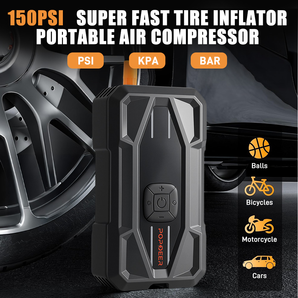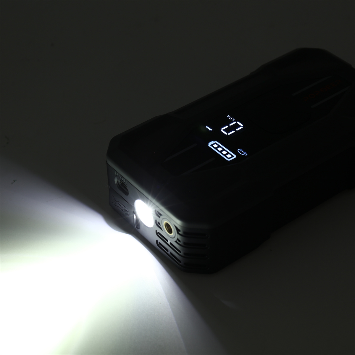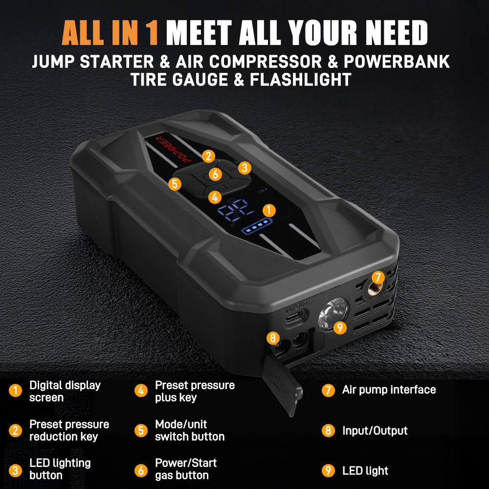 POPDEER PD-JA5 on monipuolinen 6-in-1 apukäynnistin, jossa on sisäänrakennettu rengaspumppu, 3-tilainen taskulamppu (jatkuva valo, SOS-vilkku, pitkäkestoinen valaistus >15 tunnin käyttöajalla), varavirtalähde ja rengaspaineen mittaus. Suunniteltu 12V ajoneuvoille jokapäiväiseen käyttöön ja hätätilanteisiin.