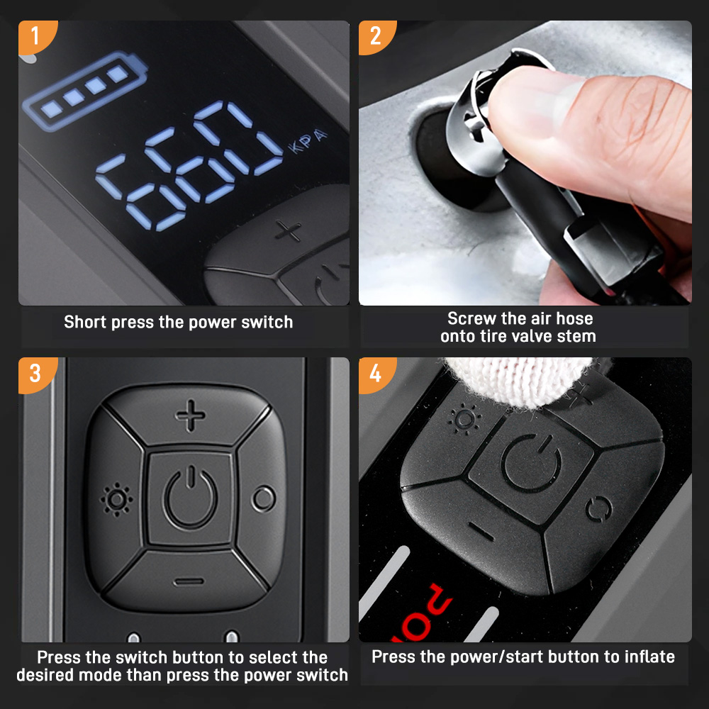 - Nopea renkaiden täyttö: turbo-kompressori, ilmavirta 35L/min, täyttää renkaan 20 PSI:iin noin 2 minuutissa (maks. 150 PSI). 4 esiasetusta autoille, moottoripyörille, polkupyörille ja urheiluvarusteille, automaattinen pysäytys estää ylitäytön.