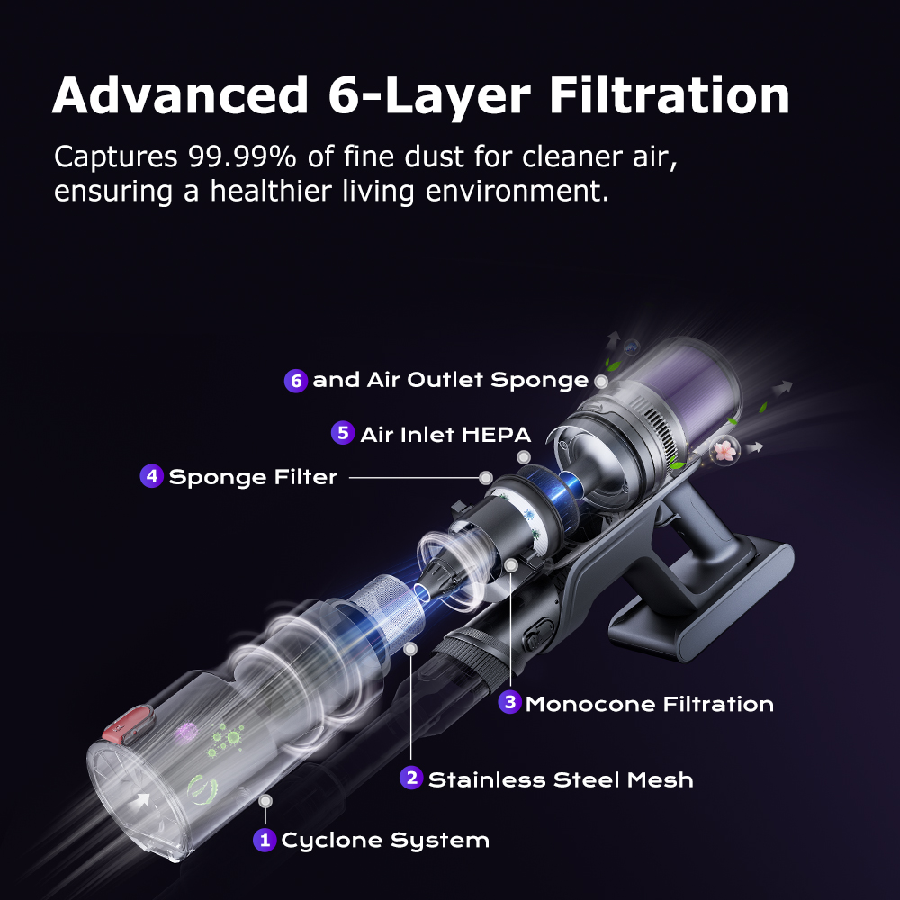 • 6-kerroksinen suodatus: edistynyt suodatusjärjestelmä vangitsee 99.99% hienopölystä puhtaamman sisäilman puolesta.