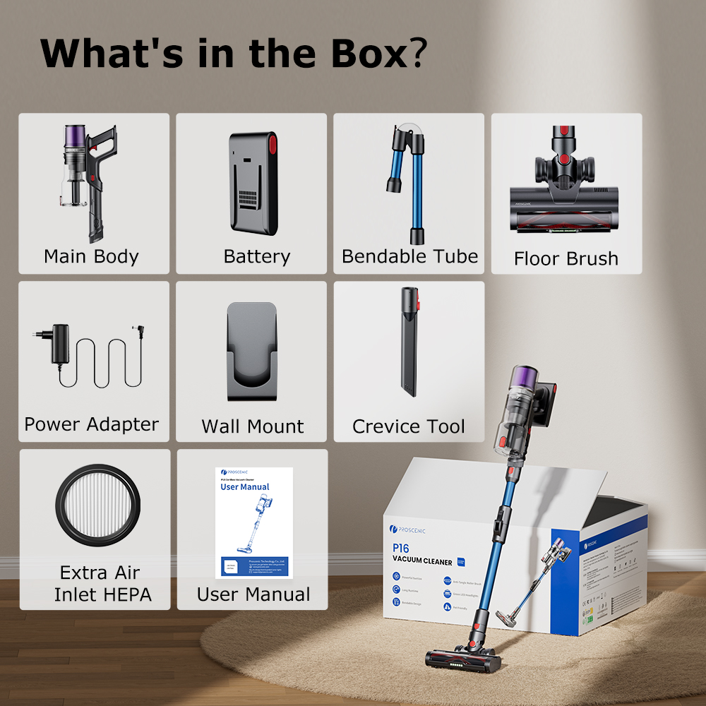 | Paketin sisältö | 1 x pääyksikkö 1 x akku 1 x taipuisa putki 1 x lattiasuulake 1 x virtalähde 1 x seinäkiinnike 1 x rakotyökalu 1 x varailmanoton HEPA-suodatin 1 x käyttöohje |