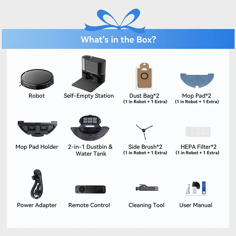 1 x robotti-imuri 1 x automaattinen tyhjennysasema 2 x pölypussi (1 laitteessa + 1 ylimääräinen) 2 x moppausliina (1 laitteessa + 1 ylimääräinen) 1 x moppilevyn pidike 1 x 2-in-1 pölysäiliö ja vesisäiliö 2 x sivuharja (1 laitteessa + 1 ylimääräinen) 2 x HEPA-suodatin (1 laitteessa + 1 ylimääräinen) 1 x virtalähde 1 x kaukosäädin 1 x puhdistustyökalu 1 x käyttöohje |
