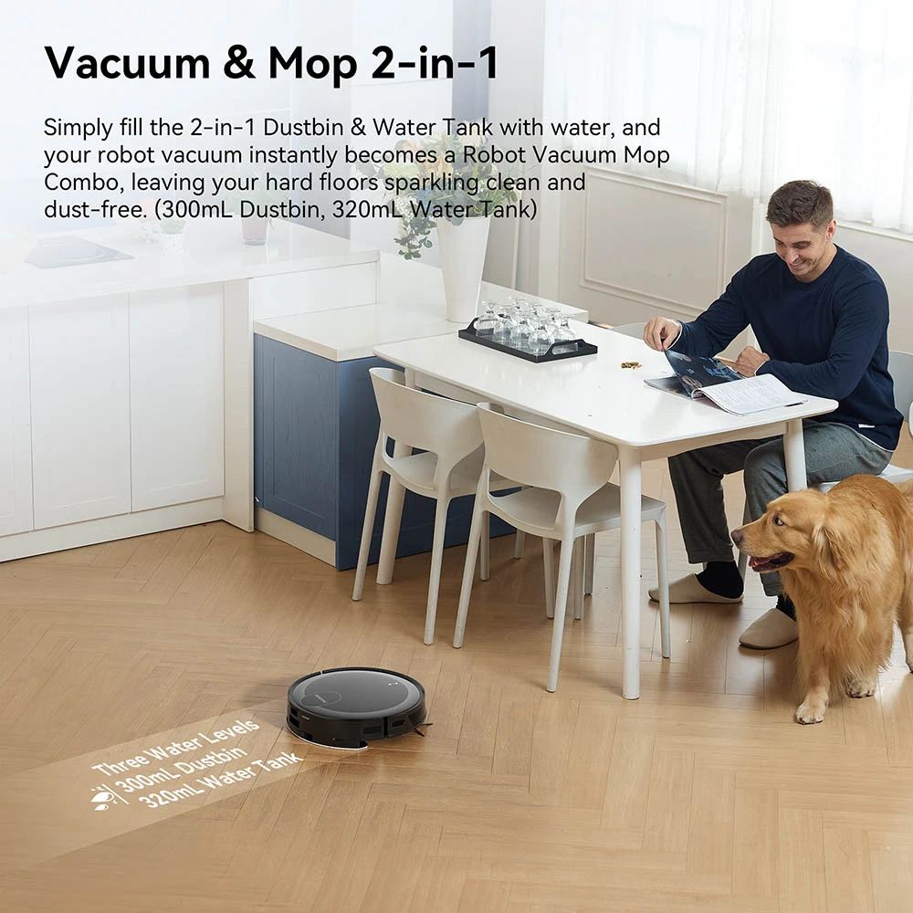 • Syväpuhdistus värisevällä mopilla ja vahvalla imuteholla: 3,000Pa imuteho ja paineistettu moppityyny, joka hankaa jopa 3,000 kertaa minuutissa, irrottavat pinttyneetkin tahrat. Valitse kolmesta imutilasta ja kolmesta vesitasosta joustavaan ja tehokkaaseen siivoukseen.