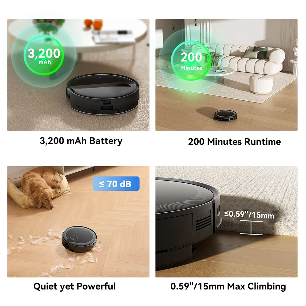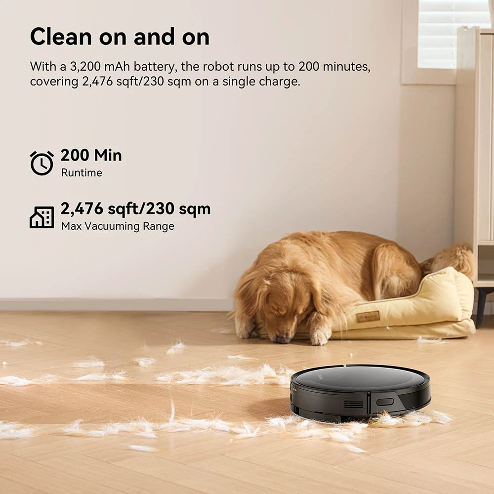 • Soveltuu suuriin koteihin: Z & Matrix Clean ja 3;200 mAh akku mahdollistavat jopa 200 minuuttia ajoa ja kattavat 2,476 sqft / 230 m² ilman, että kohdat jäävät väliin. Laite palaa automaattisesti telakkaan latautumaan ja jatkaa siivousta siitä, mihin jäi.