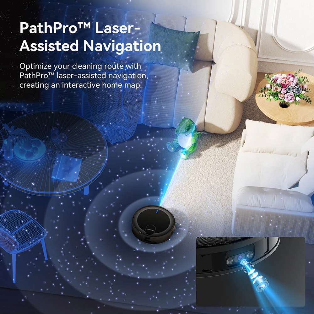 • PathPro™ laseravusteinen navigointi: Luo interaktiivinen kotikartta ja optimoi reitti. Sisäänrakennettu laser (ei yläpuolinen kuten perinteisissä LDS-malleissa) mahdollistaa liukumisen matalan kalusteen alle ja suojaa tutkaa lialta ja vaurioilta.