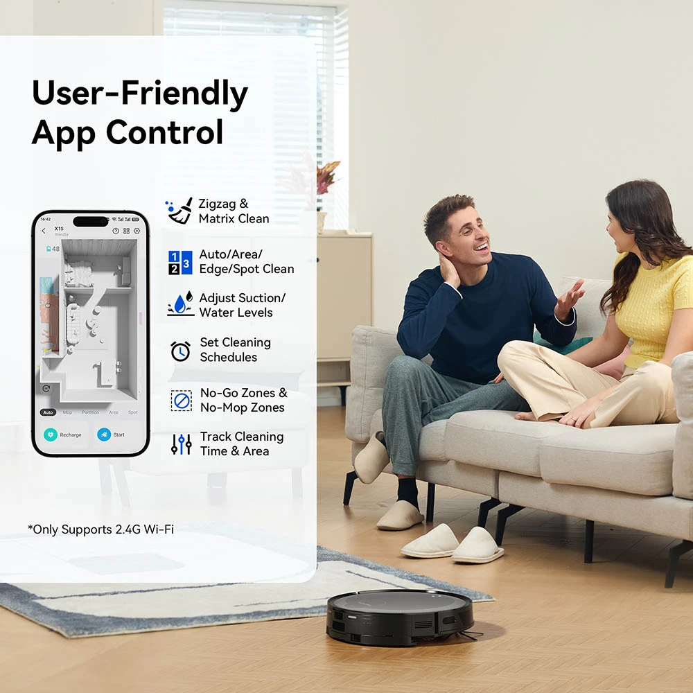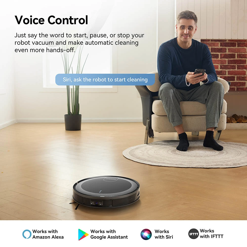 • Ääniohjaus: Yhteensopiva Amazon Alexa-, Apple Siri-, Google Home- ja IFTTT-palveluiden kanssa. Käynnistä tai pysäytä robotti äänikomennolla.