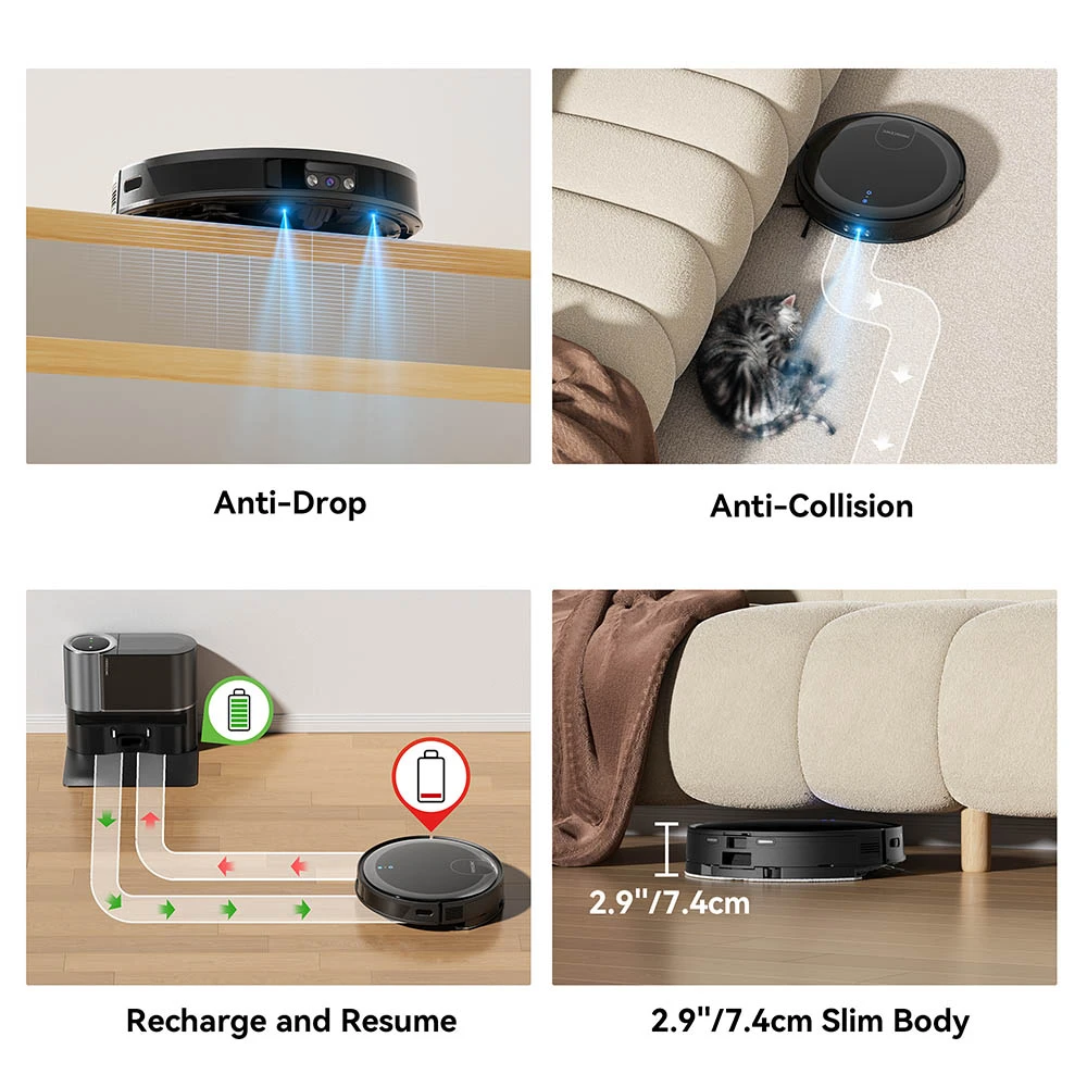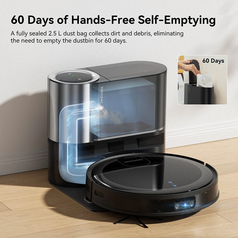 • 60 päivän huoleton tyhjennys: Täysin suljettu 2.5L pölypussi kerää lian ja roskat, joten pölysäiliötä ei tarvitse tyhjentää 60 päivään. Hyvin suunniteltu poistoaukko ja suuri imu estävät tukokset.