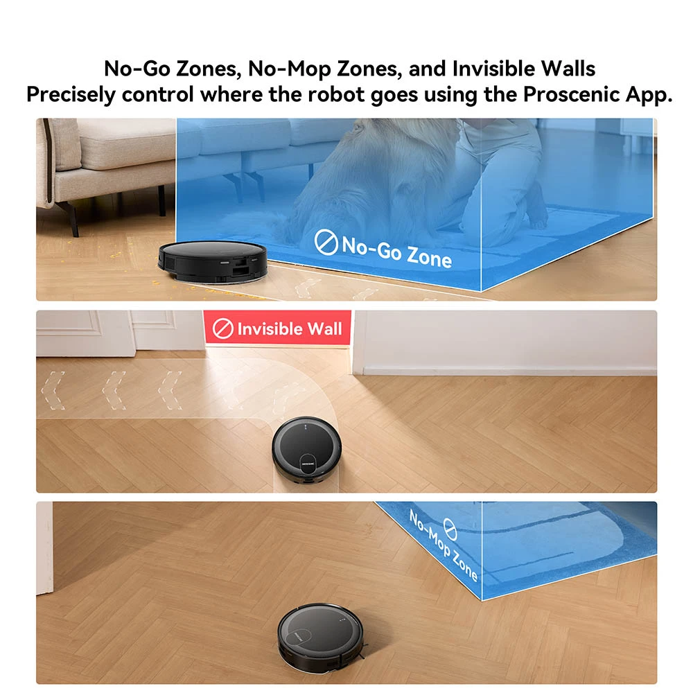 • Helppo ohjaus sovelluksella: Mukauta siivousta Proscenic-sovelluksella – aikataulut, huonekohtainen siivous, imu- ja vesitasot, kielletyt ja ei-moppausalueet sekä siivousajan ja -alan seuranta. Tallenna kartat jopa 5 tasolle ja personoi asetukset.