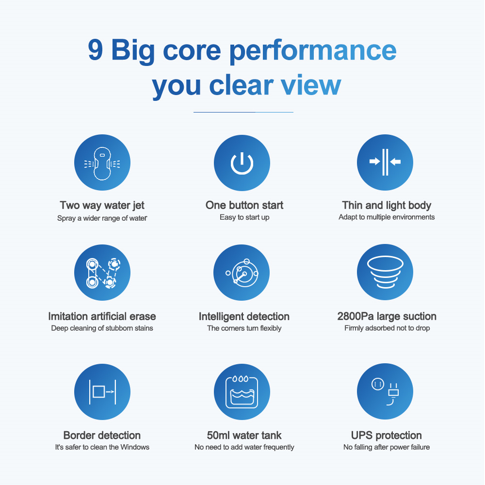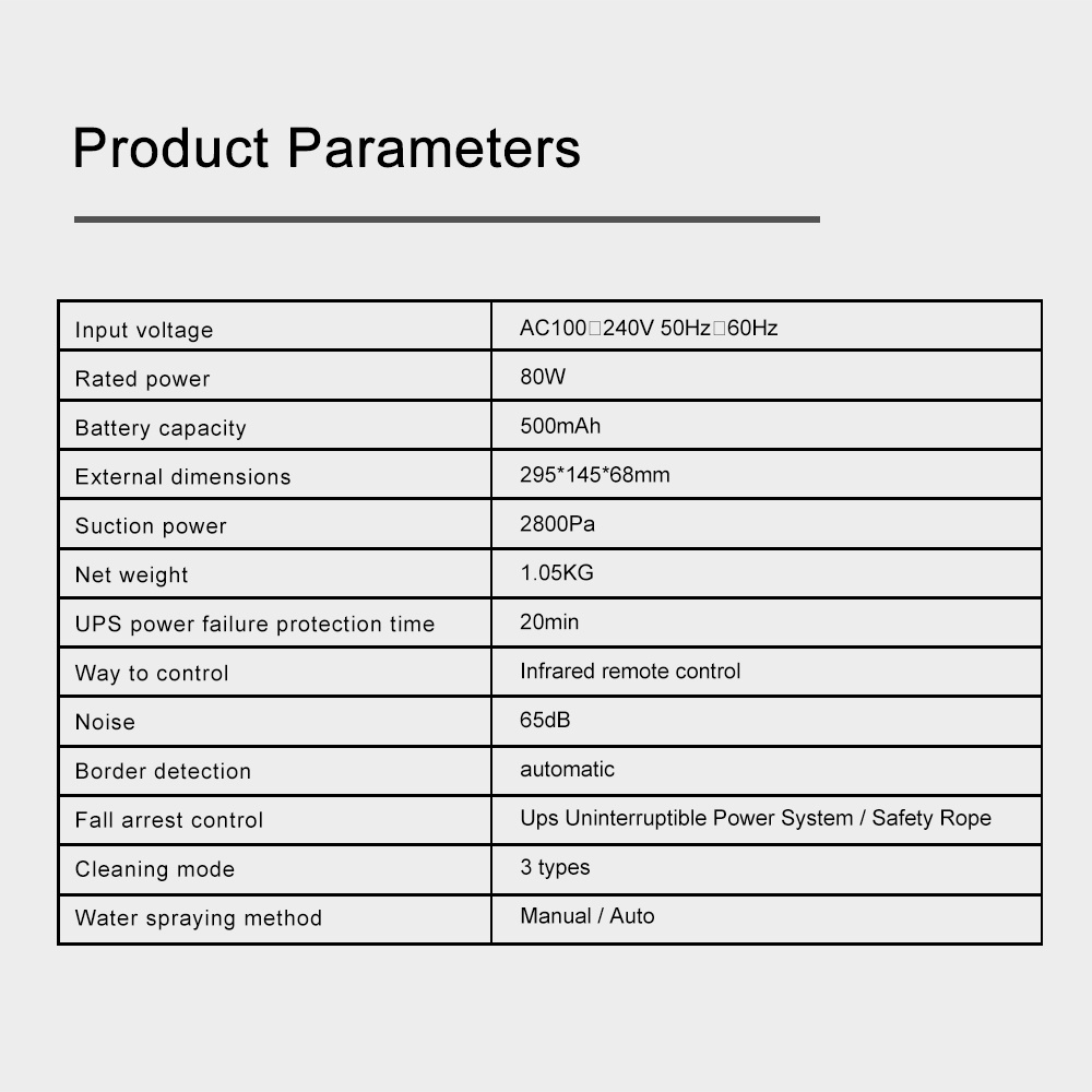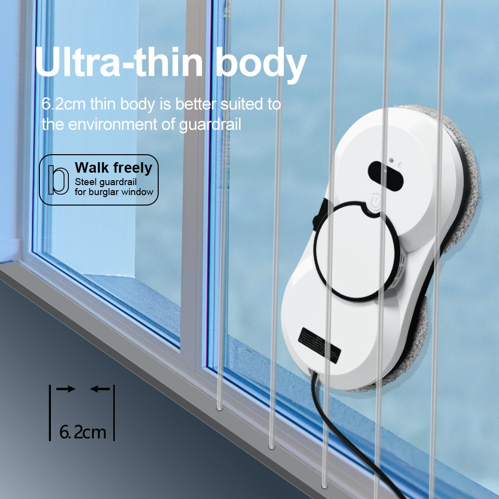 Älykäs ikkunanpuhdistin helpottaa arkea: tehokas 2800Pa imuteho, automaattinen reunan tunnistus ja UPS-pohjainen putoamissuojaus varmistavat varman käytön myös virrankatkon aikana. Infrapunakaukosäädin ja 3 puhdistustilaa tekevät ohjauksesta helppoa, 50ml vesisäiliö tehostaa pesua, ja 65dB äänitaso on miellyttävä sisätiloissa.