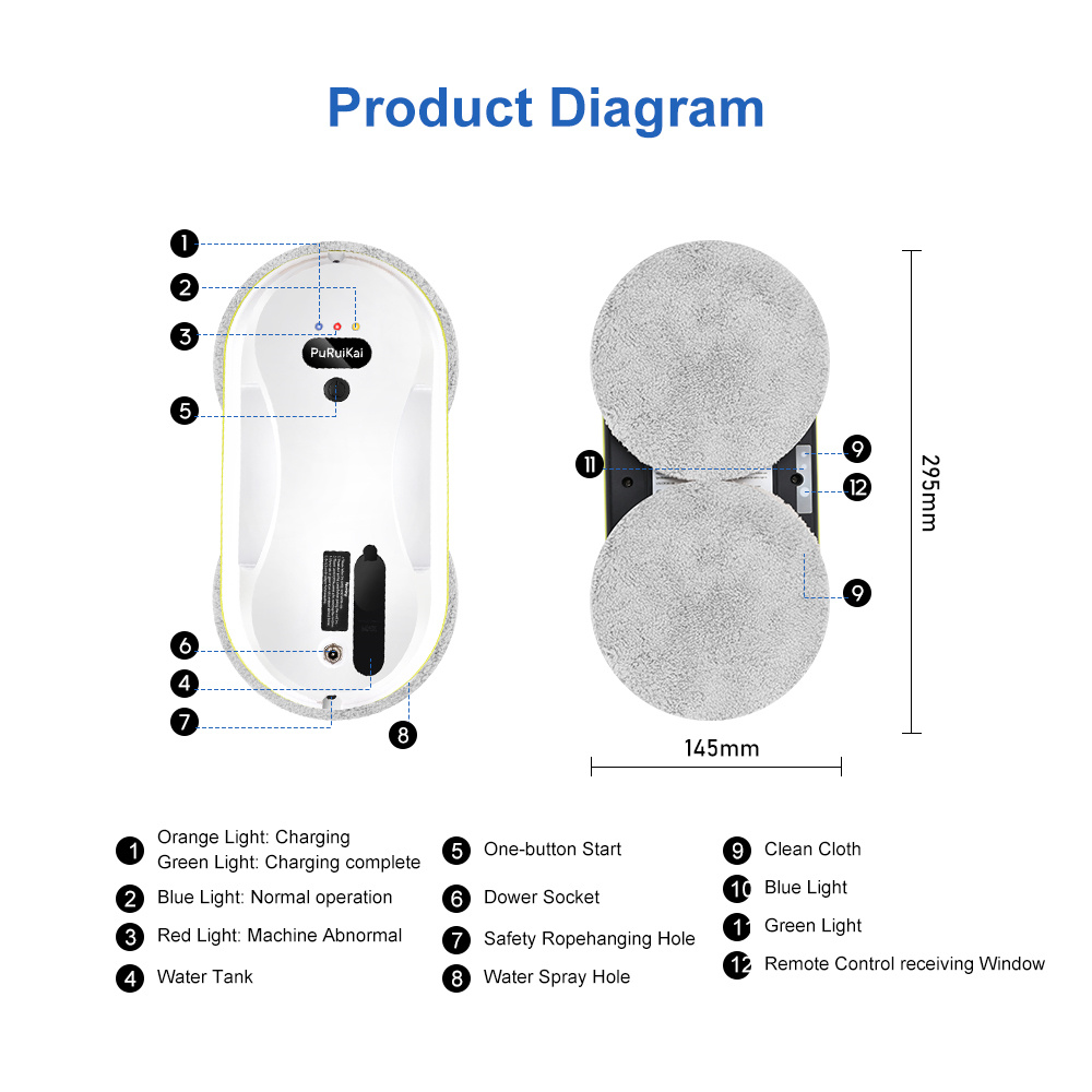PuRuiKai PRK-309 on seinä- ja ikkunapintoihin kiinnittyvä robottipuhdistin, jossa on automaattinen vedenpumppaus, harjaton moottori ja turvallisuusvarmistukset sähkökatkon varalta. Se puhdistaa mikrokuituliinalla nopeasti ja hellävaraisesti jättämättä tahroja.