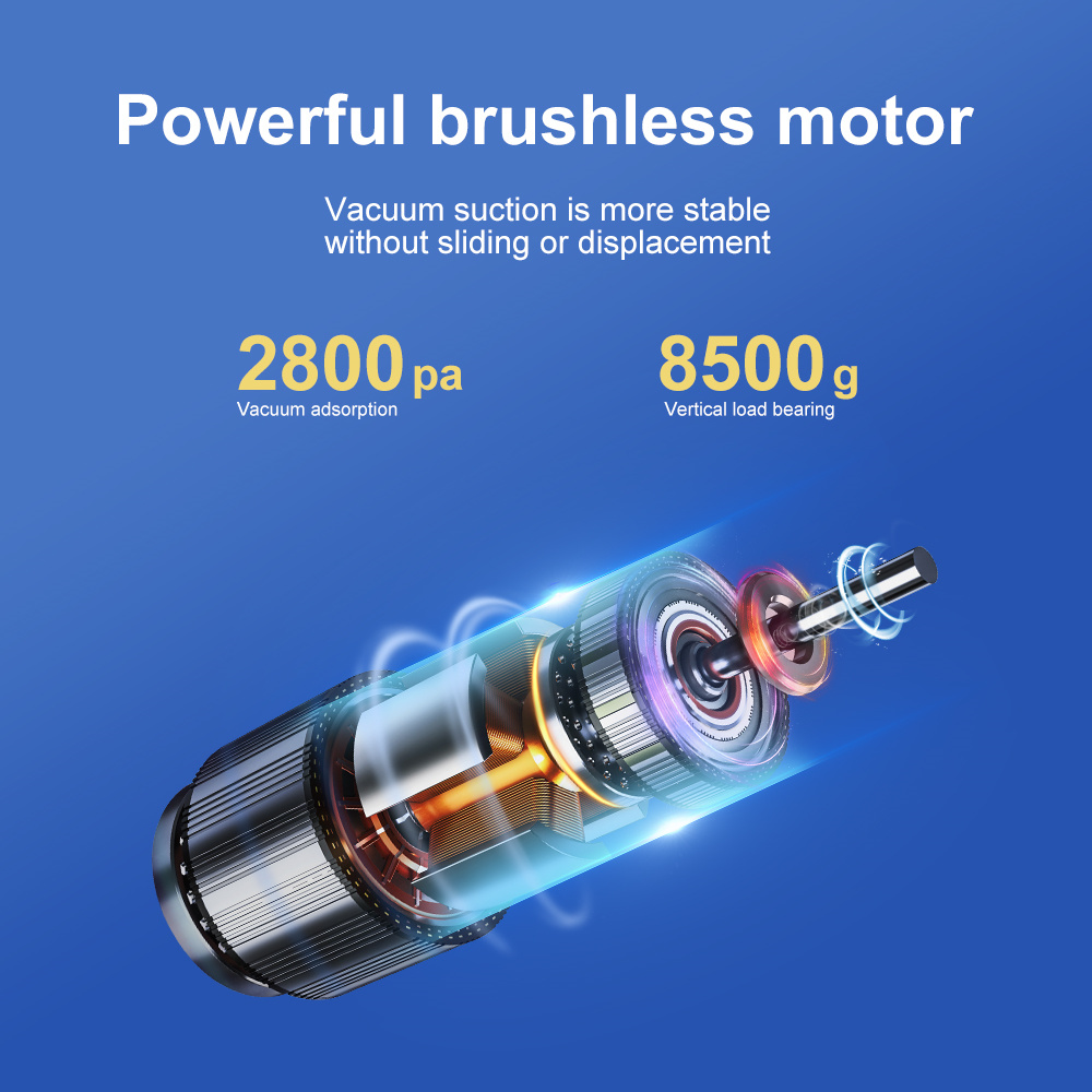 3. 【Harjaton moottori】Päivitetty harjaton moottori tuottaa korkean imutehon, joka pitää laitteen tukevasti pystylasilla nopeaa ja painavaa puhdistusta varten. Ei tarvitse pelätä putoamista käytön aikana.