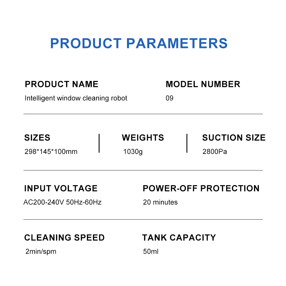 1. 【Helppo käyttää】Laite kytketään verkkovirtaan. Paina virtapainiketta, niin kaksi pyörää liikkuu vapaasti ikkunan tai seinän pinnalla. Jos punainen valo vilkkuu, tarkista, että virtalähde on kytketty oikein.