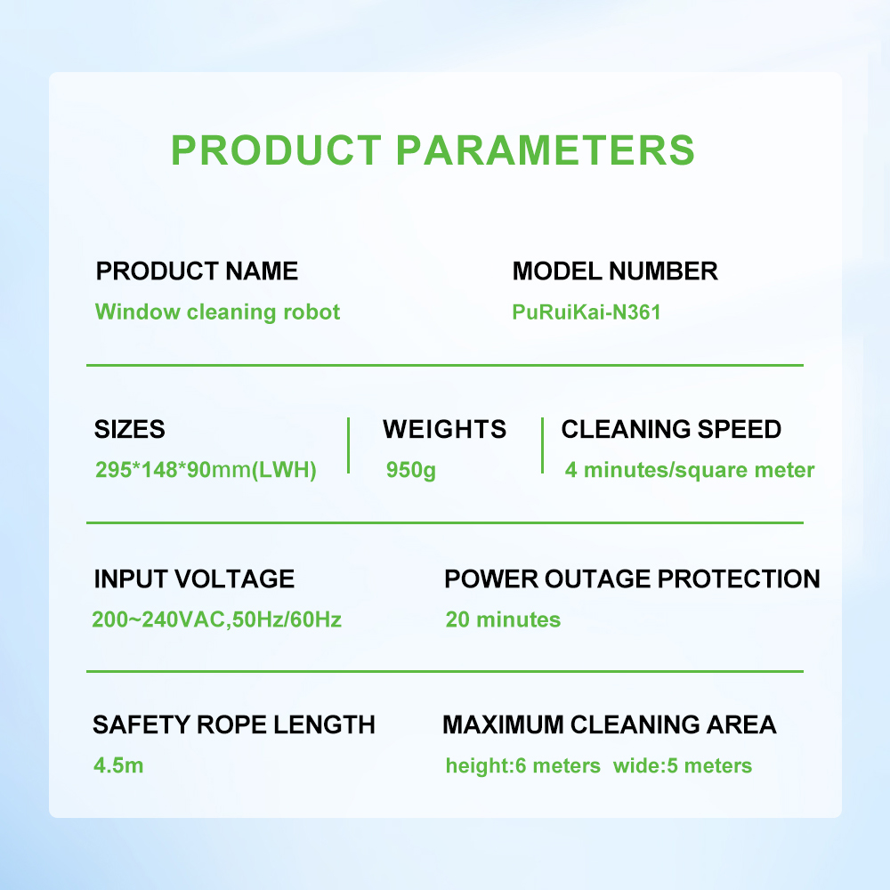 PuRuikai PRK01-N361 on ikkunanpuhdistusrobotti, joka puhdistaa lasipinnat tasaisesti ja jättää ne raidattomiksi. Laitetta voi ohjata kaukosäätimellä, ja sähkökatkossuojaus pitää sen turvassa 20 minuuttia mahdollisen katkoksen aikana. Puhdistusnopeus on 4 minuuttia / neliömetri, ja mukana tuleva turvaköysi tuo lisäturvaa käytön aikana.