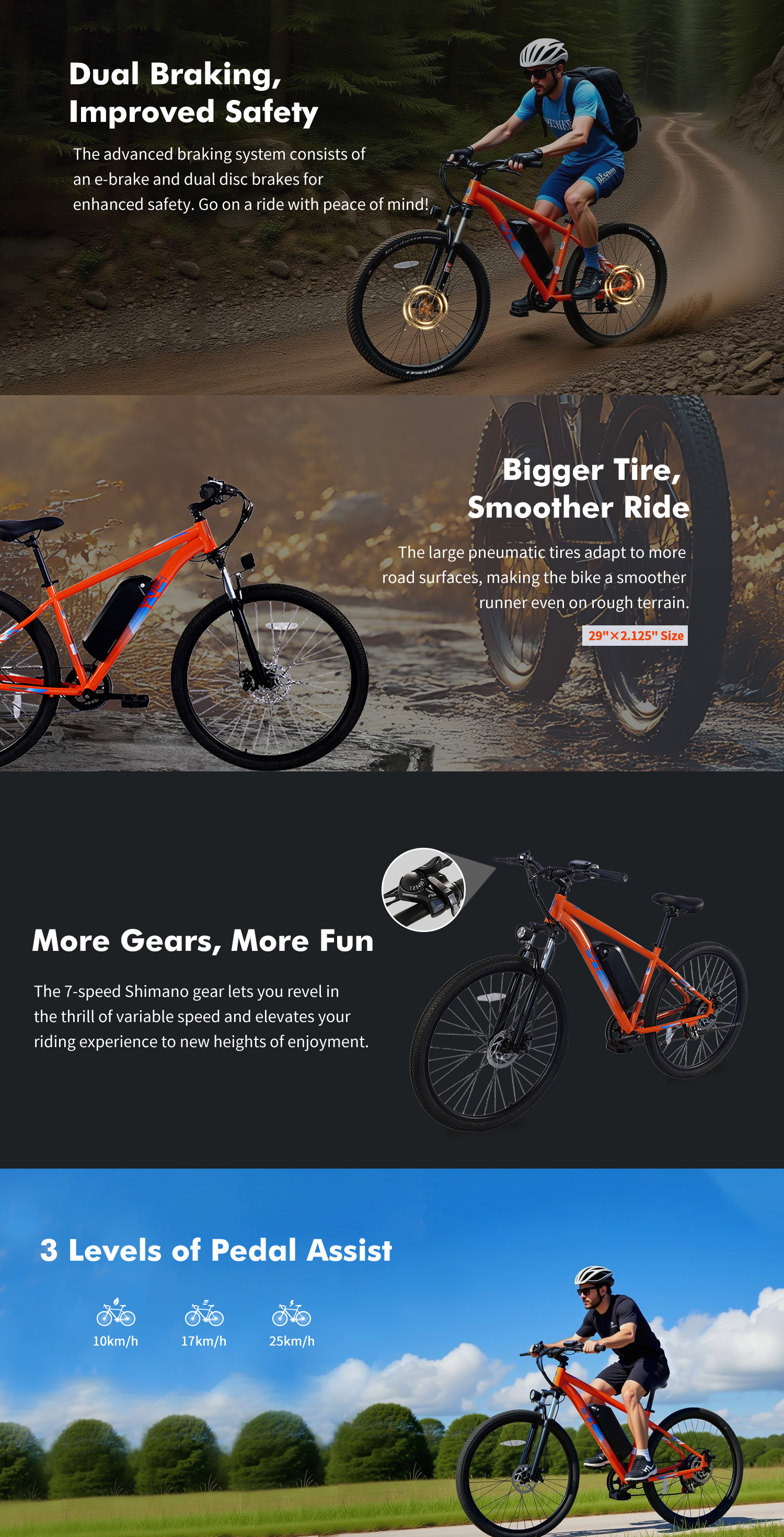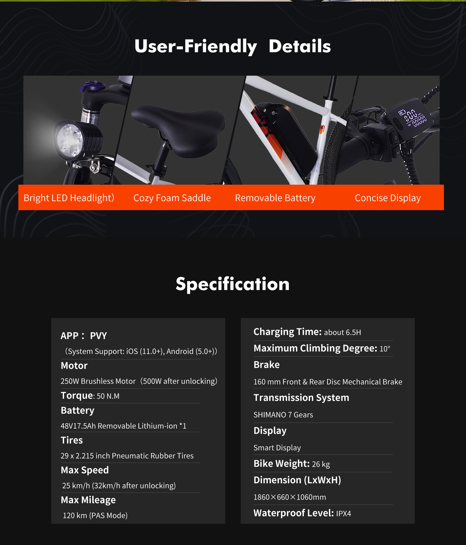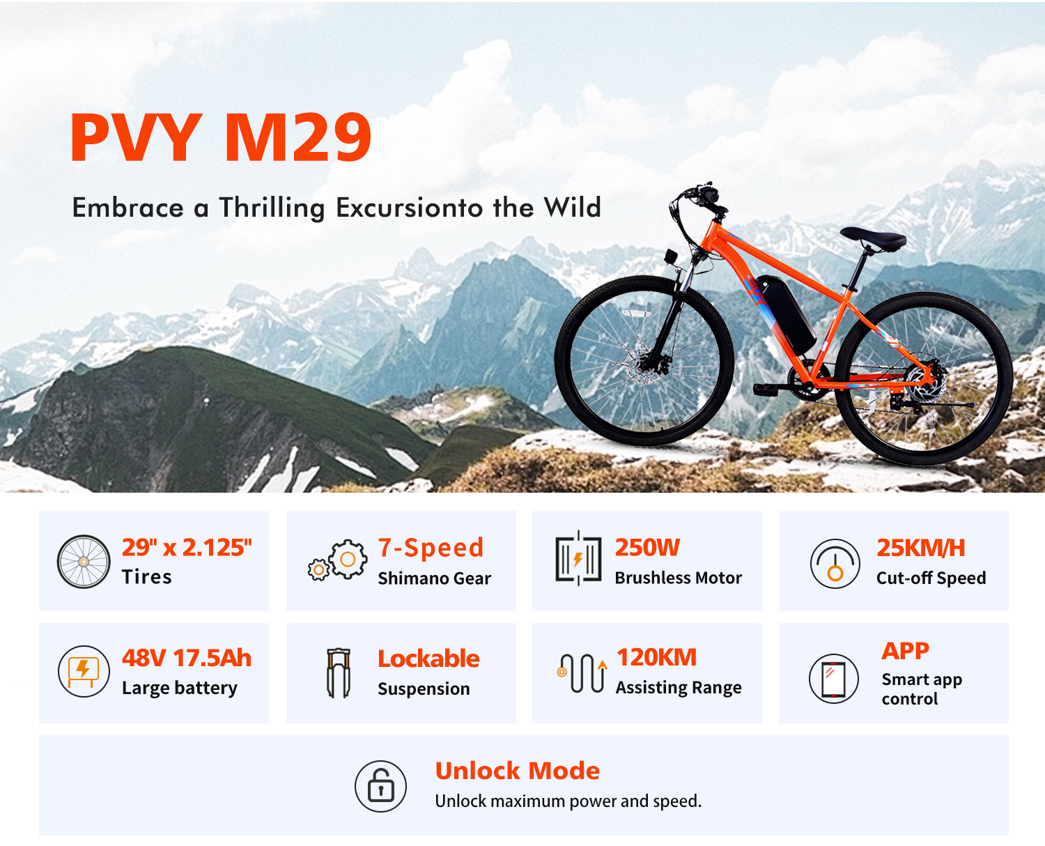 PVY M29 on sähkömaastopyörä, jossa on rautarunko, 29-tuumaiset renkaat ja tehokas 48V 17.5AH irrotettava akku. SHIMAN0 7-vaihteinen vaihteisto, edessä joustohaarukka lukituksella sekä etu- ja takana mekaaniset levyjarrut tarjoavat vakaan ja turvallisen ajokokemuksen niin kaupunkiin kuin sorateillekin. G-DRIVE kaksinkertainen ohjausjärjestelmä ja kadenssianturi tekevät poljinavustuksesta tasaisen ja miellyttävän.