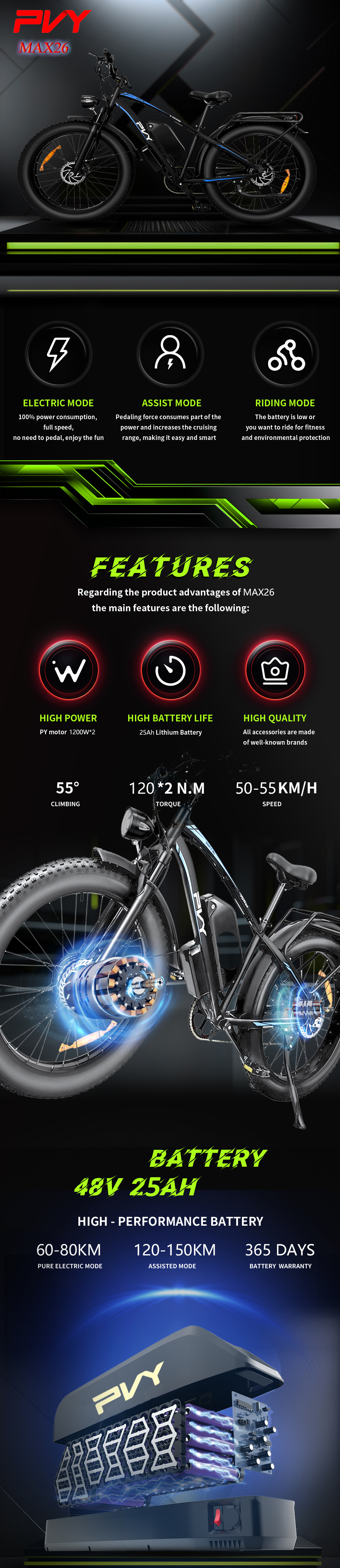 PVY MAX26 sähköpyörä 48V 25Ah akku kaksoismoottorit 1200W 26x4,0 renkaat 150 km toimintamatka