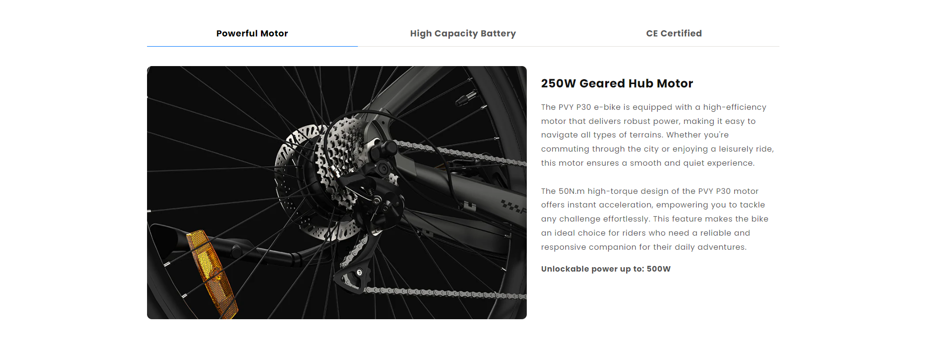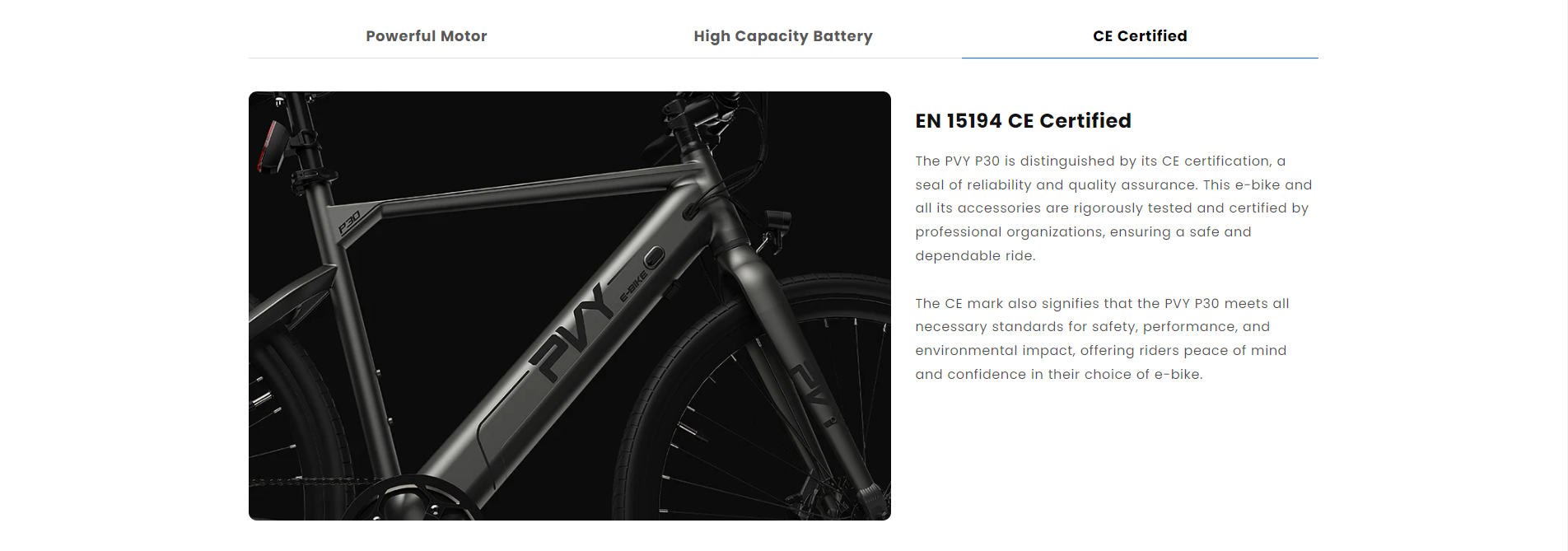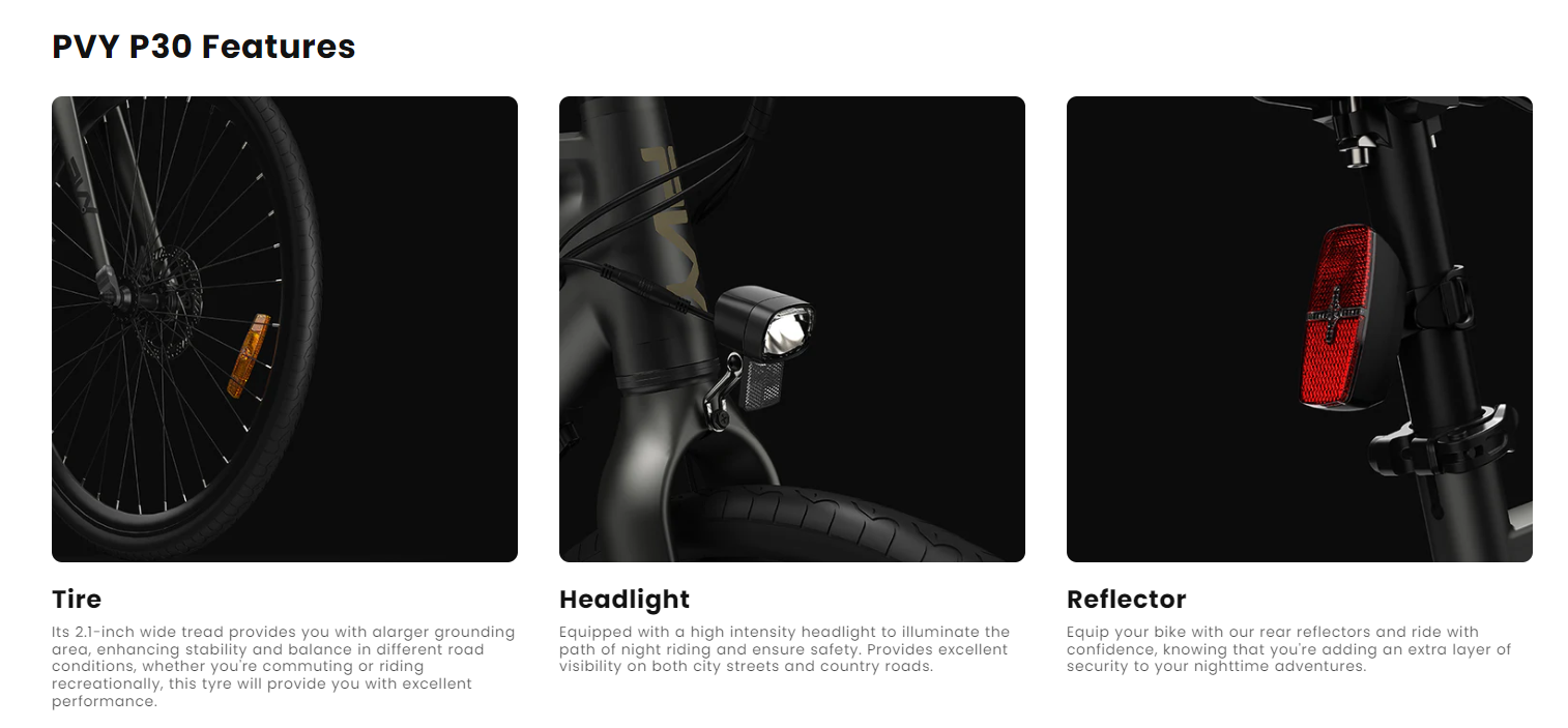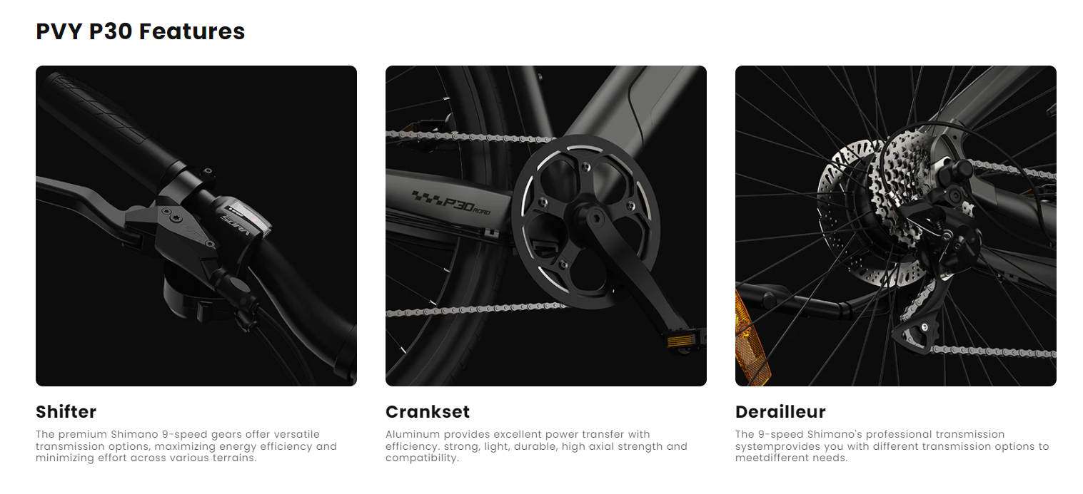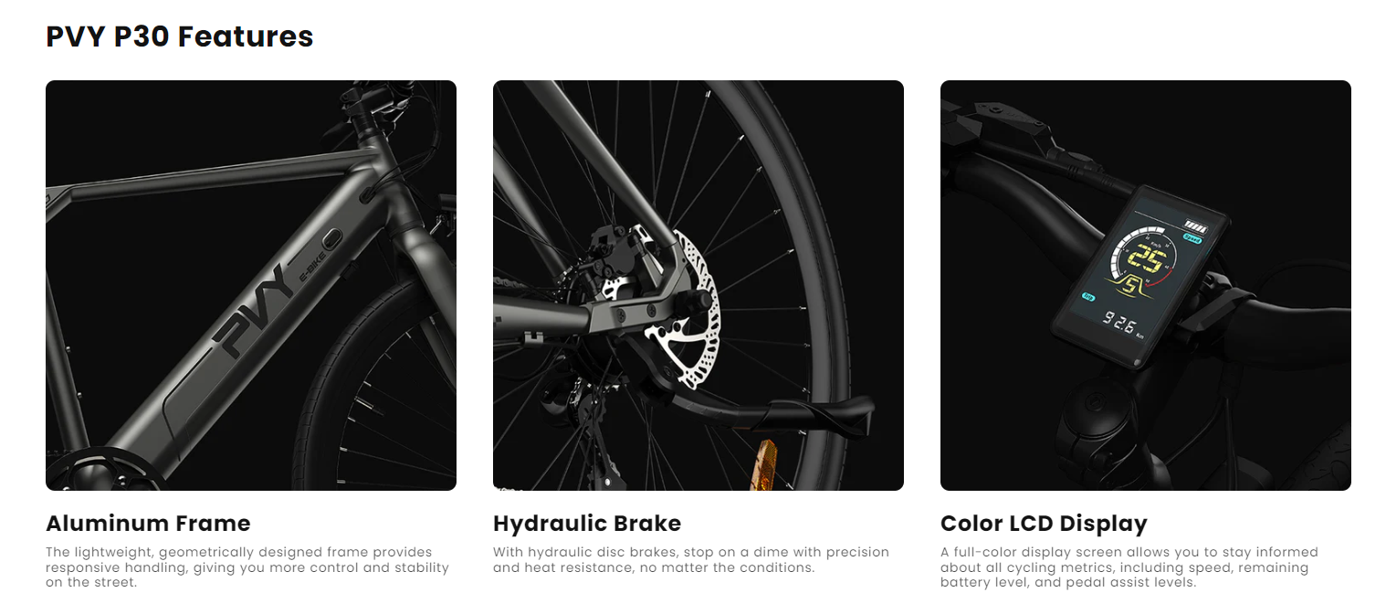 PVY P30 on monikäyttöinen sähköpyörä, joka on suunniteltu arjen työmatkoille ja pidemmille vapaa-ajan ajoreiteille. Kevyt, päivitetystä 6061-alumiinista valmistettu runko, hydrauliset levyjarrut ja vääntöanturi tarjoavat miellyttävän ja hallitun ajokokemuksen sekä kaupunkiajossa että hiekkateillä.