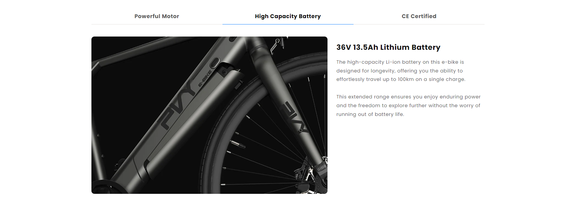 - 36V 13.5Ah akku tukee pidempiä ajomatkoja yhdellä latauksella.